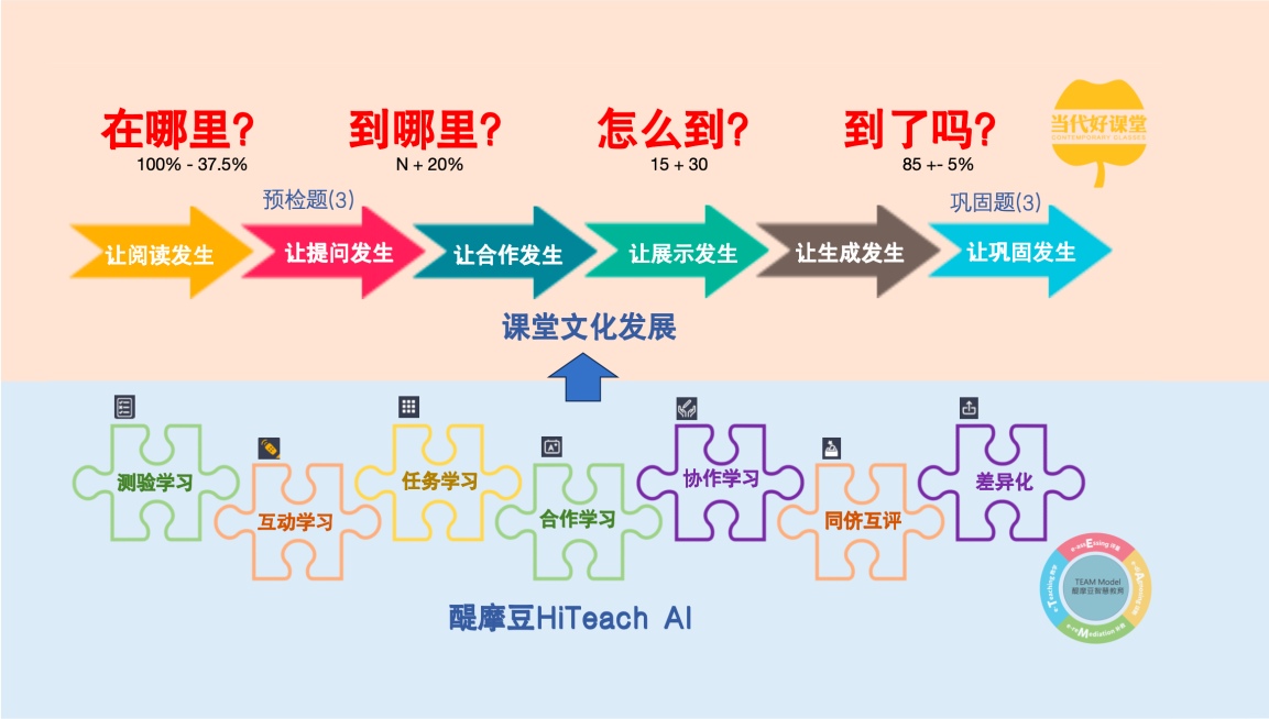 打造一堂好課的成功密碼:文化+技術(shù)。其中,文化需緊扣四大核心追問(wèn)——“在哪里?”“到哪里?”“怎么到?”“到了嗎?”,依托六個(gè)發(fā)生:以“讓閱讀發(fā)生”激活思維,以“讓提問(wèn)發(fā)生”深化探究,以“讓合作發(fā)生”促進(jìn)社會(huì)性成長(zhǎng),以“讓展示發(fā)生”錘煉表達(dá)力,以“讓生成發(fā)生”推動(dòng)創(chuàng)新遷移,以“讓鞏固發(fā)生”實(shí)現(xiàn)結(jié)構(gòu)化沉淀。最后,利用HiTeach七大方法策略(包括測(cè)驗(yàn)?zāi)K、互動(dòng)模塊、任務(wù)模塊、合作學(xué)習(xí)模塊、協(xié)作模塊、同儕互評(píng)和差異化等功能)實(shí)現(xiàn)技術(shù)賦能,確保教學(xué)過(guò)程的高效推進(jìn),讓學(xué)習(xí)真實(shí)發(fā)生,助力打造一堂高質(zhì)量的好課。