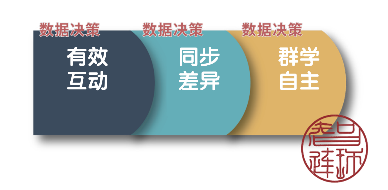 智連環(huán)學(xué)習(xí)法課堂,是運用數(shù)據(jù)智慧決策的現(xiàn)代課堂,包括有效交互、同步差異、群學(xué)自主等三個主要環(huán)節(jié),簡述如下: