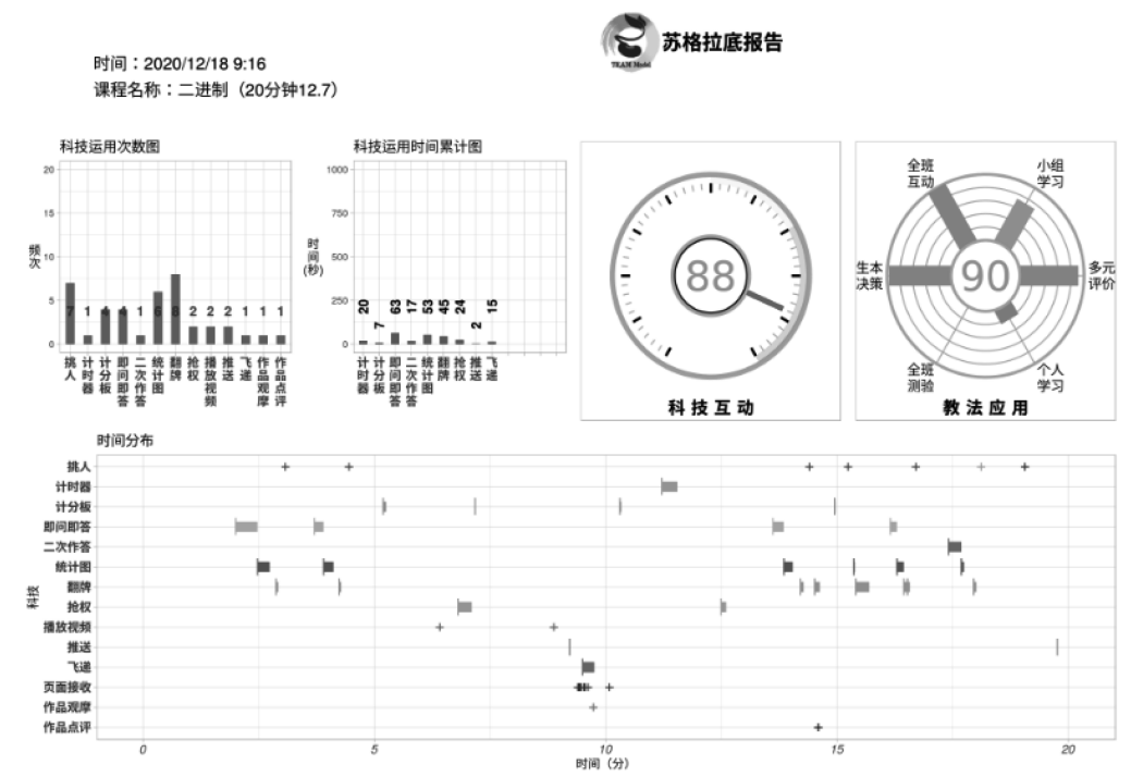 醍摩豆(TEAM Model)智慧教學(xué)平臺(tái)貫穿教學(xué)前、中、后的學(xué)習(xí)歷程,關(guān)注每位學(xué)生學(xué)習(xí),非常具有智能性,具體表現(xiàn)在智能決策、智能實(shí)施、智能評(píng)價(jià)等環(huán)節(jié)。同時(shí),它可以通過人工智能采集課堂交互與教法應(yīng)用的相關(guān)數(shù)據(jù),自動(dòng)生成專業(yè)的教學(xué)分析報(bào)告,實(shí)現(xiàn)課堂教學(xué)精準(zhǔn)研討,輔助教師專業(yè)成長(zhǎng),這是醍摩豆(TEAM Model)智慧教學(xué)平臺(tái)中的蘇格拉底服務(wù)系統(tǒng)[12],如圖2。
