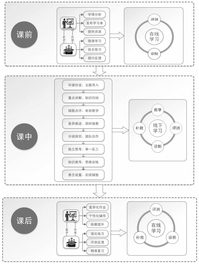 翻轉(zhuǎn)課堂(Flipped Classroom)將“先教后學(xué)”倒置為“先學(xué)后教”,進(jìn)行了教學(xué)流程的逆序創(chuàng)新,促使教與學(xué)的方式發(fā)生變化。智慧課堂以嶄新的智慧教育理念為指導(dǎo),積極借鑒翻轉(zhuǎn)課堂應(yīng)用實(shí)踐的成果經(jīng)驗(yàn),對(duì)翻轉(zhuǎn)課堂進(jìn)行重塑和升級(jí),突破翻轉(zhuǎn)課堂的“效果天花板”和“認(rèn)知天花板”,為當(dāng)前階段技術(shù)支持下的智慧教育提供典型范例[9]。智慧課堂應(yīng)用資源分層共享、實(shí)時(shí)內(nèi)容推送、學(xué)習(xí)情境采集、智能學(xué)習(xí)分析、即時(shí)反饋評(píng)價(jià)、協(xié)作互動(dòng)交流和移動(dòng)通信互聯(lián)等技術(shù),促進(jìn)學(xué)習(xí)模式變革[10]。