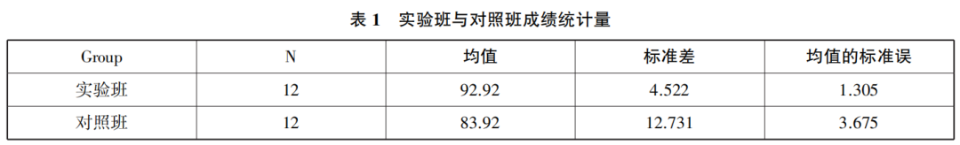 教學(xué)任務(wù)完成后,分別對(duì)兩個(gè)班級(jí)進(jìn)行后測(cè)。實(shí)驗(yàn)班的平均值為92.92分,對(duì)照班的平均值為83.92分,即實(shí)驗(yàn)班的學(xué)生平均分高于對(duì)照班的學(xué)生的平均分,見表1。實(shí)驗(yàn)班的標(biāo)準(zhǔn)差為4.522,對(duì)照班的標(biāo)準(zhǔn)差為12.731 ,實(shí)驗(yàn)班學(xué)生的成績(jī)比較集中,離散程度小;對(duì)照組學(xué)生的成績(jī)比較分散,離散程度大。