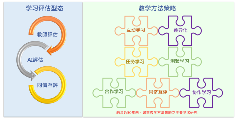 圖左是學(xué)習(xí)評(píng)估新型態(tài),結(jié)合先進(jìn)生成式AI技術(shù),把人工智能引入課堂,隨時(shí)協(xié)助教師批改作業(yè)、評(píng)分、評(píng)語,協(xié)助課堂總結(jié)歸納、分析、講解,讓課堂中實(shí)施教師評(píng)估、同儕互評(píng)、AI評(píng)估,形成教師、學(xué)生與AI三合一的學(xué)習(xí)共同體。圖右是教學(xué)策略新模組,這是融合近50年來,課堂主要教學(xué)方法策略的學(xué)術(shù)研究,發(fā)展出支持合作學(xué)習(xí)、互動(dòng)學(xué)習(xí)、任務(wù)學(xué)習(xí)、多元評(píng)量、差異化、同儕互評(píng)、分組協(xié)作等七大教學(xué)策略模組。