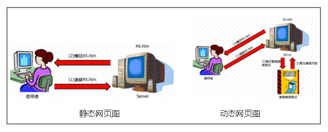 數(shù)位學(xué)習(xí)平臺(tái)網(wǎng)站是一種應(yīng)用動(dòng)態(tài)網(wǎng)頁(yè)技術(shù)(例如:使用 ASP 、 PHP 、 JSP 網(wǎng)頁(yè)編程語(yǔ)言)的網(wǎng)站,網(wǎng)頁(yè)內(nèi)容會(huì)根據(jù)不同用戶帳號(hào)或用戶的選擇內(nèi)容,而動(dòng)態(tài)生成的網(wǎng)頁(yè)內(nèi)容。而所謂靜態(tài)網(wǎng)頁(yè)則是把已經(jīng)建置好的網(wǎng)頁(yè)文件放在服務(wù)器上,當(dāng)用戶透過(guò)瀏覽器瀏覽網(wǎng)頁(yè)時(shí),會(huì)直接把服務(wù)器上的網(wǎng)頁(yè)文件下載到瀏覽器中。