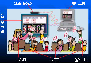 此外,在只有一臺(tái)電腦的教室里,安裝一套稱(chēng)為高交互系統(tǒng)的設(shè)備,是另一種非常成熟的應(yīng)用模式。教師就可以透過(guò)電腦與所有上課的學(xué)生創(chuàng)建高交互的機(jī)制。教室課堂上,學(xué)生每人手中拿著一個(gè)遙控器,與一個(gè)與電腦連接的接收器,就可以進(jìn)行隨堂測(cè)驗(yàn)活動(dòng)或游戲比賽活動(dòng),如下圖所示: