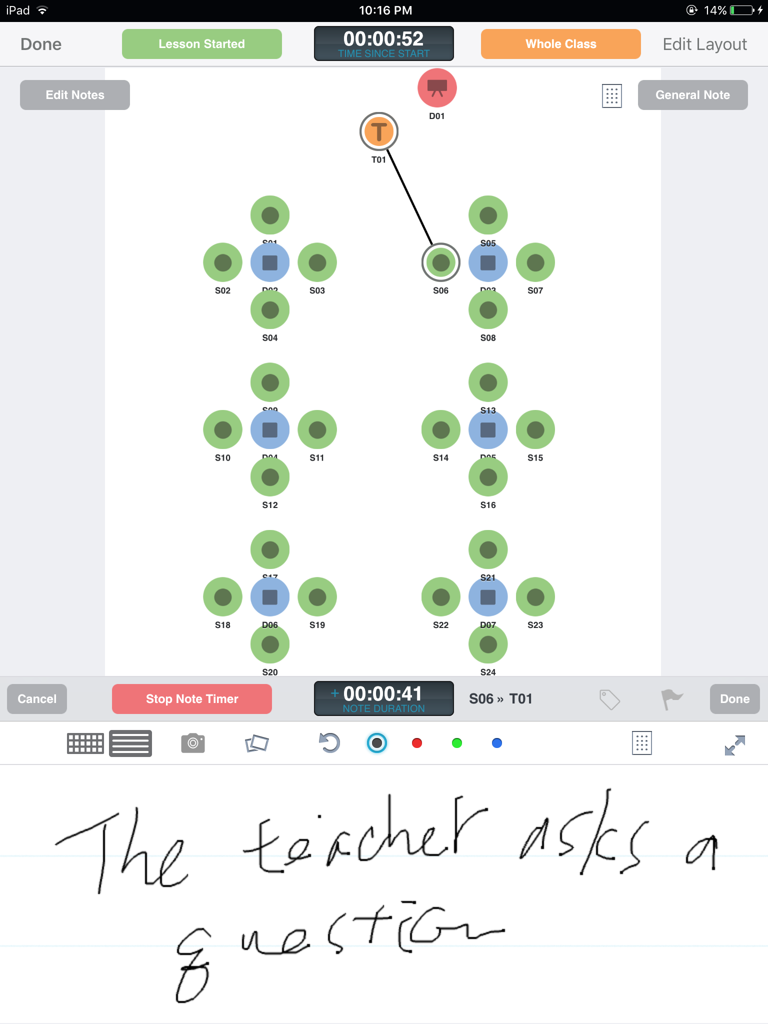 LessonNote (Version 3.8.1; Lesson Study Alliance, 2018)系統(tǒng)是一套透過iPad平板計算機進行課堂紀錄的應用程序。LessonNote保留座位表的特性,觀察者將在課堂上觀察到的行為透過畫記、筆記、錄音、照相等方式將師生互動記錄下來(圖2)。這些紀錄都附有事件戳記方便課后排序追蹤。整體而言,LessonNote可視為座位表紀錄的進化版本;LessonNote能記錄的模式較多元,也有時間戳記方便事后分析。傳統(tǒng)的座位表記錄也許可做到類似的效果,但需要動用的人力相當可觀,而觀察員之間的同步協(xié)調(diào)也不容易達到。圖二: LessonNote操作界面