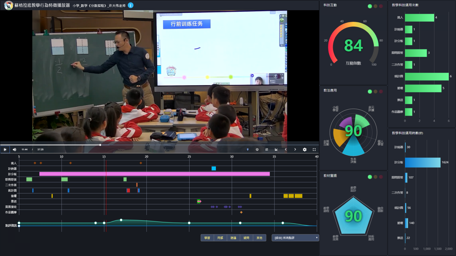 3.2 蘇格拉底影片 過去的研究指出,若是多了上課錄像的輔助,老師的反思內(nèi)容將明顯與單純依靠記憶進行反思不同,原本只靠回想進行反思的重點都集中在教室管理以及自己的表現(xiàn),有了影片輔助后,老師的反思重點將轉移到授課內(nèi)容與學生的表現(xiàn)(Rosaen, Lundeberg, Cooper, Fritzen, & Terpstra, 2008)。為了進一步提升教研的效率,基于靜態(tài)蘇格拉底教學行為分析報告的基礎,我們開發(fā)了結合上課實錄、智慧標簽、與智能分析圖表的「蘇格拉底影片」,一方面讓教研的過程能更清楚看到教學現(xiàn)場實際發(fā)生的狀況,另一方面也讓擔任該堂課教學的老師對自己的教學實踐有更深入的體會與反思。