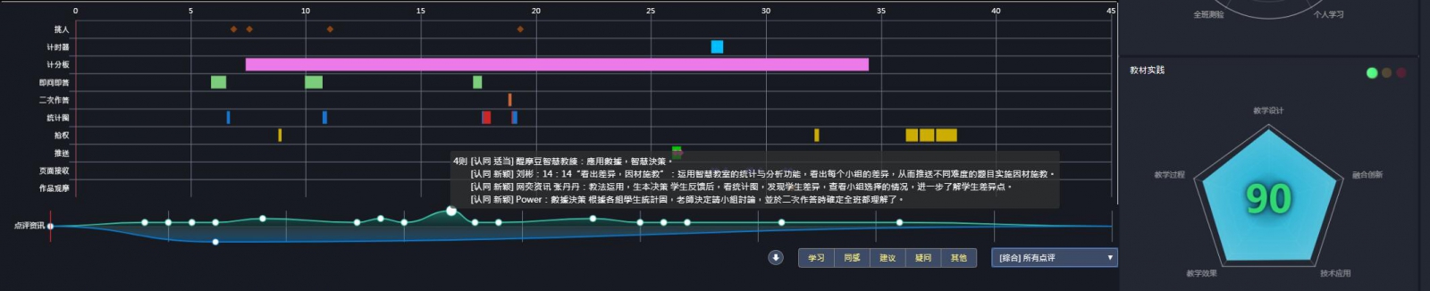 3.2.2. 點評 此外,蘇格拉底播放器不只是單純的影片與報告的結合,我們同時加入了點評功能(圖4黃框),專家、參與教研或議課的老師、以及授課老師本身都可以在這部影片加入點評注解。首先授課教師可在課后重看自己的上課錄像進行自我反思時寫下自評記錄或是說課注記,而受邀請的專家可對教學內(nèi)容給予專業(yè)的意見,幫助老師們精進教學;共同參與教研或議課的老師們也都可以寫下自己的點評意見,供自己以及授課教師參考。在點評界面中可以選擇不同角色(圖5選擇點評者):(1)觀看專家及其他共同參與教研或議課教師的點評內(nèi)容,或是(2)選擇本人以進行點評。當選擇觀看他人點評內(nèi)容時,可以在時間軸上有點評標簽的地方點一下,就會浮現(xiàn)點評內(nèi)容(圖5紅色箭頭),當角色切換到自己時,就可以透過圖5點評選項處進行標注,并寫下點評的意見。另外,盡管蘇格拉底系統(tǒng)透過自動化的方式來采集與分析數(shù)據(jù),但是機器的能力有限。目前并非所有的課堂行為都有辦法透過機器精確地分析。舉例來說,機器很難判斷這整堂課教學過程的演繹是否流暢、授課教材是否恰當;兩份同課同構的數(shù)據(jù)可能是一模一樣的,但是不同老師在演繹相同的教學模式上可能有很大的不同。這時還是需要有專家以人工的方式來給予評價,所以我們加入了「教材實踐」這個指數(shù)(圖最右邊小圖),當有專家觀看這堂課時,就可進行評分。