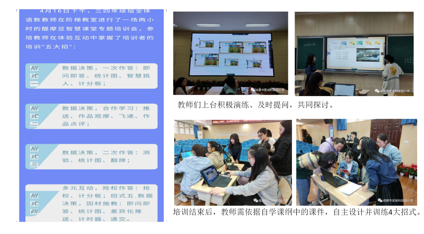 4月16日下午,我們終于迎來醍摩豆韓影老師的到來。她對三四年級組全體語數(shù)教師在階梯教室進行了一場兩小時的醍摩豆智慧課堂專題培訓會,參培教師在體驗互動中掌握了培訓者的培訓“五大招”: