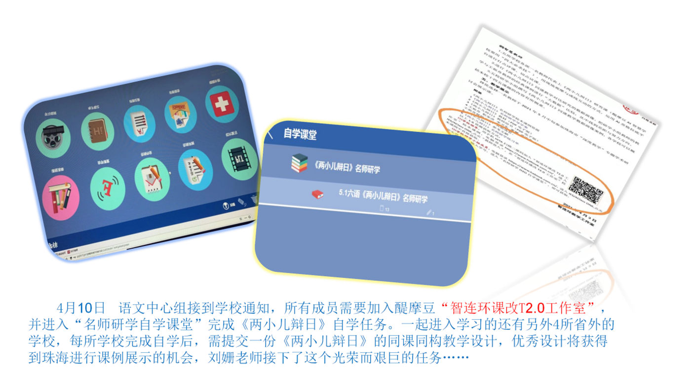 緊接著語文中心組接到學校通知,所有成員需要加入醍摩豆“智連環(huán)課改T2.0工作室”,并進入“名師研學自學課堂”完成《兩小兒辯日》自學任務。一起進入學習的還有另外4所省外的學校,每所學校完成自學后,需提交一份《兩小兒辯日》的同課同構(gòu)教學設計,優(yōu)秀設計將獲得到珠海進行課例展示的機會,劉姍老師接下了這個光榮而艱巨的任務……4月23日,劉姍老師進行模擬試講,語文中心組成員扮演學生參與課堂,李紅路專家全程線上聽課,課后馬上進行了在線指導。慢慢地我們才意識到李老師和所有專家的區(qū)別,李老師的指導小到每句過渡語,甚至是標點符號,真心讓所有一線老師們深深的折服。
