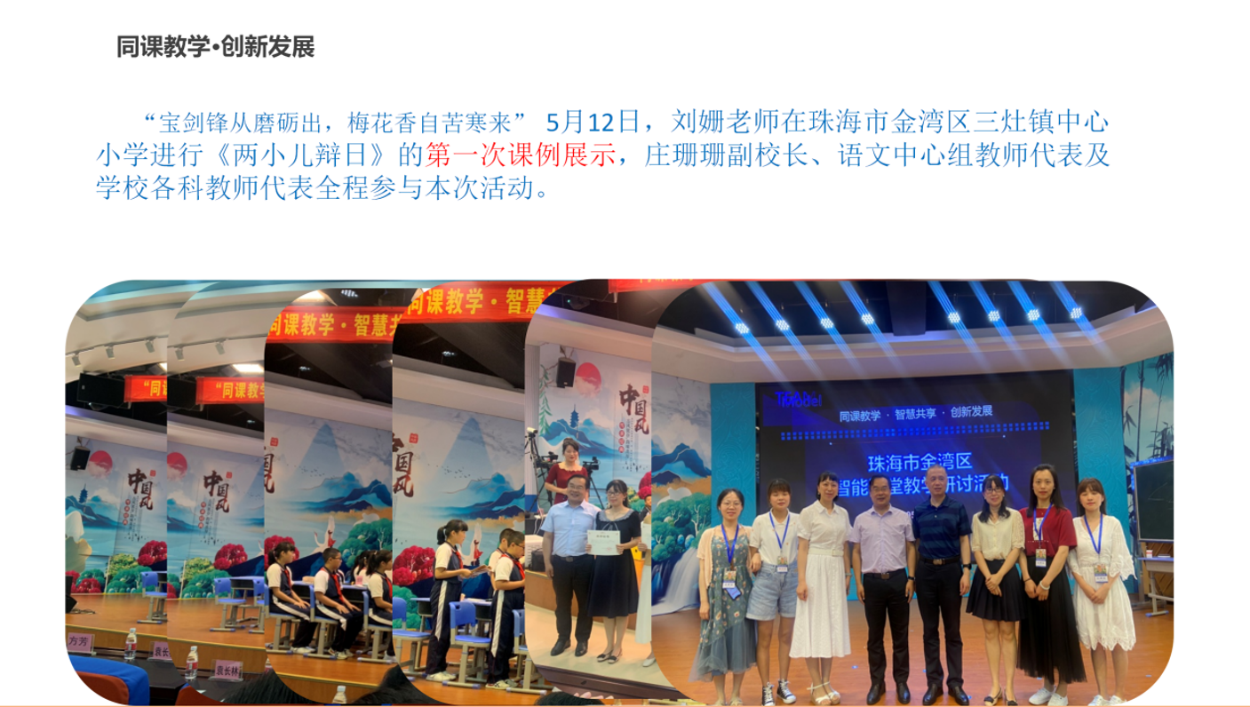 5月12日,劉姍老師在珠海市金灣區(qū)三灶鎮(zhèn)中心小學進行《兩小兒辯日》的第一次課例展示,莊姍姍副校長、語文中心組教師代表及學校各科教師代表全程參與本次活動。