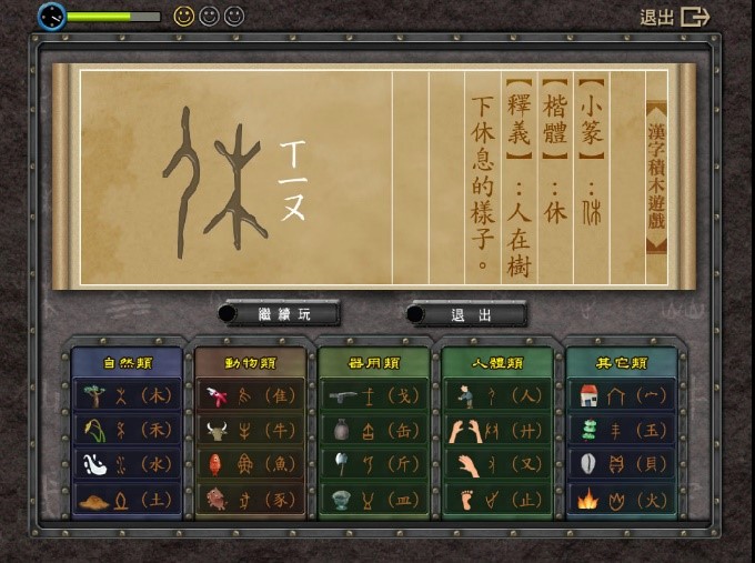 漢字游戲也很多元,可以設(shè)計(jì)“拉霸”游戲,選對(duì)生字,就有積分,選錯(cuò)則倒扣,也可設(shè)計(jì)爬階梯的游戲,選對(duì)字音、字形、字義,則可進(jìn)階,否則,會(huì)降一格來提示學(xué)生。教師可以設(shè)計(jì)大富翁的游戲,學(xué)生擲骰子決定向前幾步,然后依指示寫字形、讀字音、說字義,做為自我檢測(cè)的練習(xí)。其他如:重組字詞、替換字詞、字形辨別、改錯(cuò)字等,不一而足,教師可以運(yùn)用釣魚、轉(zhuǎn)盤、插卡等游戲方式,變換游戲內(nèi)容,增加學(xué)習(xí)的趣味。我國中央研究院數(shù)位典藏資源網(wǎng),有漢字積木游戲,提供20個(gè)偏旁,每一次可以選擇2-4個(gè)部件來組成文本,在限定的時(shí)間內(nèi)可以測(cè)試組字能力。圖標(biāo)如下: