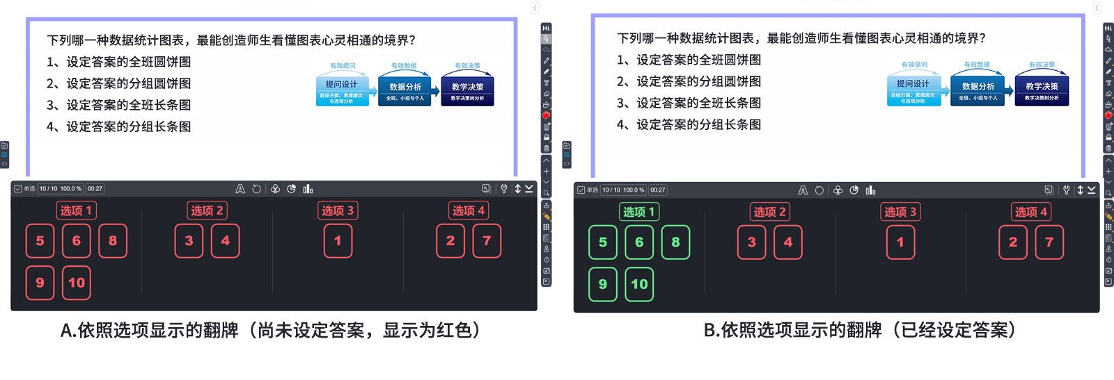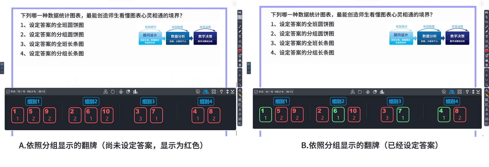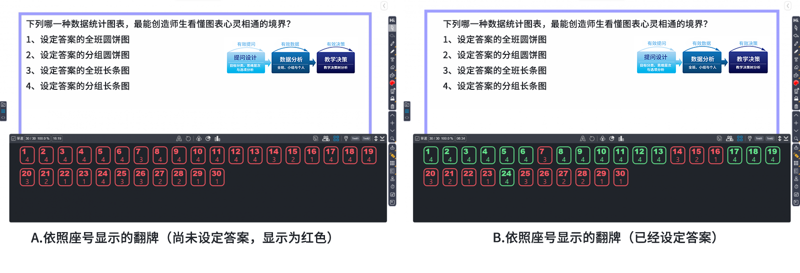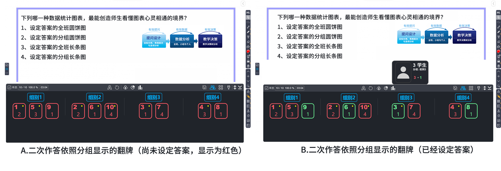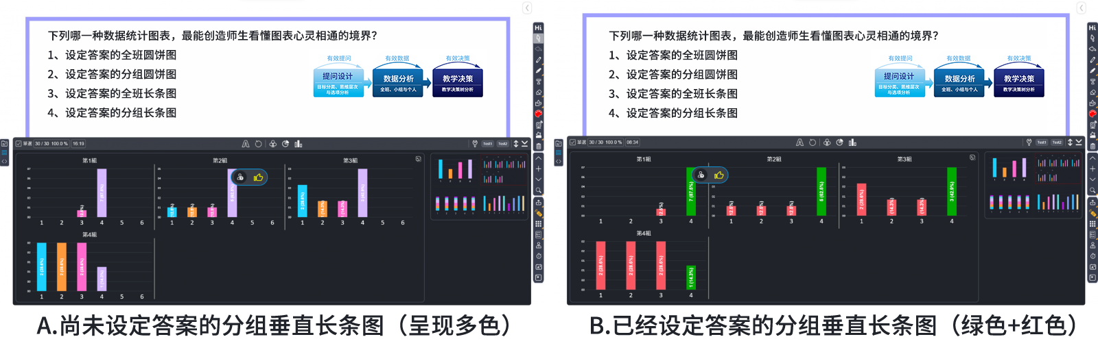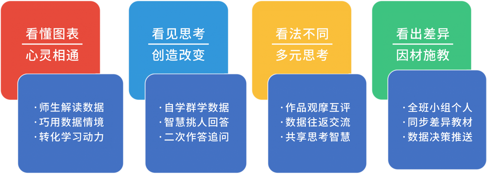 教師提問實(shí)時(shí)生成數(shù)據(jù)后,看見全班、小組,甚至每一位學(xué)生的思考。再進(jìn)一步應(yīng)用數(shù)據(jù)來創(chuàng)造改變,藉此,喚醒迷思的、不懂的學(xué)生,真正創(chuàng)造思考轉(zhuǎn)變與理解。