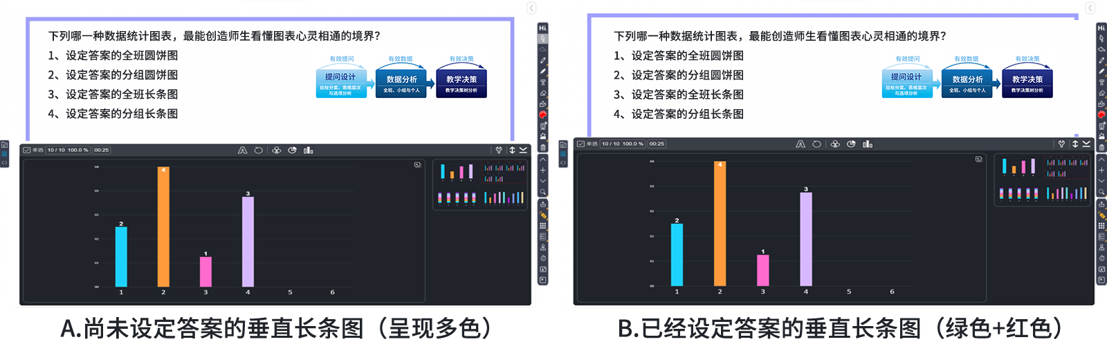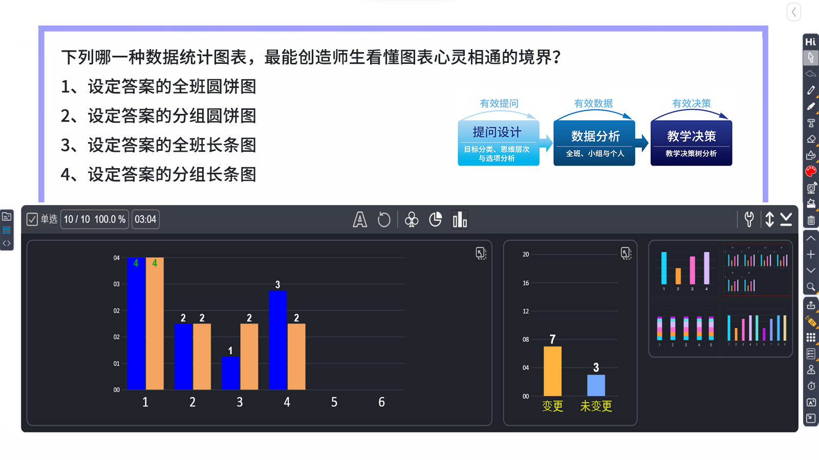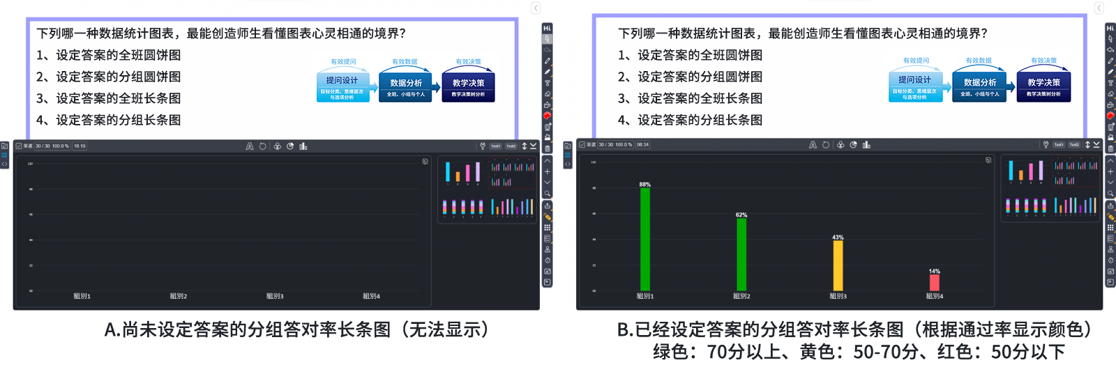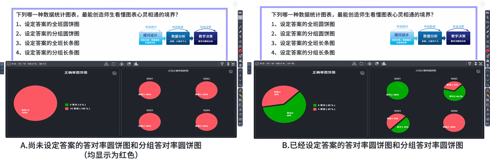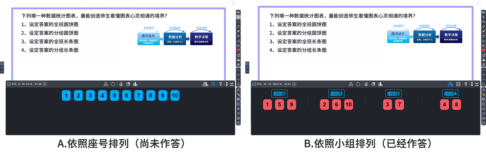 教師提問實(shí)時(shí)生成數(shù)據(jù)后,看見全班、小組,甚至每一位學(xué)生的思考。再進(jìn)一步應(yīng)用數(shù)據(jù)來創(chuàng)造改變,藉此,喚醒迷思的、不懂的學(xué)生,真正創(chuàng)造思考轉(zhuǎn)變與理解。