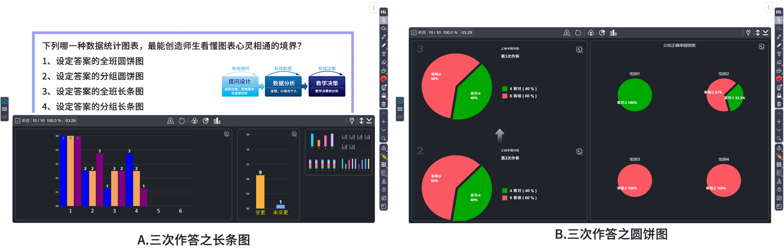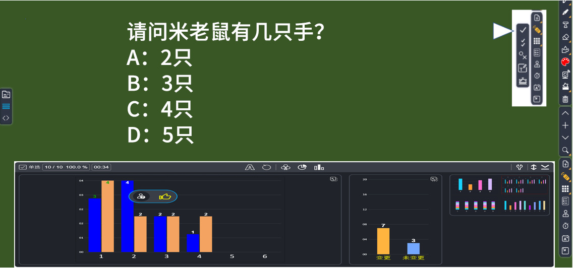 二次作答是指第一次作答結(jié)束后,經(jīng)過統(tǒng)計(jì)結(jié)果或討論后,請(qǐng)學(xué)生再次作答的教學(xué)活動(dòng)。學(xué)生反饋數(shù)據(jù)收集在數(shù)據(jù)互動(dòng)區(qū),二次作答后,可比對(duì)兩次數(shù)據(jù)之變化,看見學(xué)生思考轉(zhuǎn)變的歷程。當(dāng)然,老師也可再次深追問,請(qǐng)學(xué)生說明改變?cè)?、理由,澄清迷思,清晰概念。二次作答統(tǒng)計(jì)圖表顯示如圖