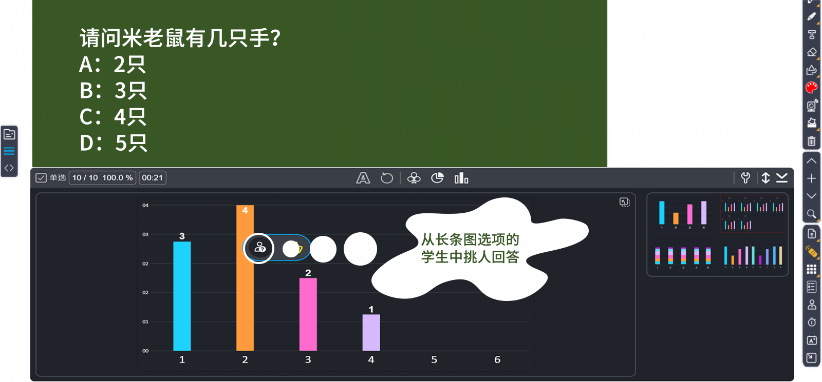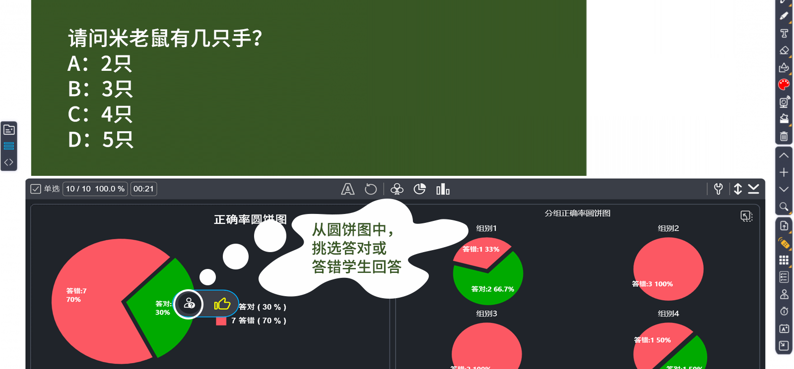 智慧挑人功能是根據(jù)學(xué)生反饋數(shù)據(jù)的追問活動(dòng),利用統(tǒng)計(jì)圖表背后的反饋數(shù)據(jù)來挑人回答。教師可以在各式長(zhǎng)條圖或圓餅圖中,依據(jù)答題正確與否、依據(jù)答案選項(xiàng)、是否變更選項(xiàng)等數(shù)據(jù)群組來挑選回答者。智慧挑人操作直觀、簡(jiǎn)便,只需在統(tǒng)計(jì)圖表上按一下,再選擇挑人鈕,就會(huì)從所選數(shù)據(jù)中隨機(jī)挑出號(hào)碼,如圖