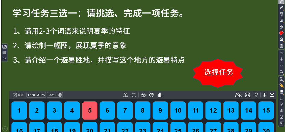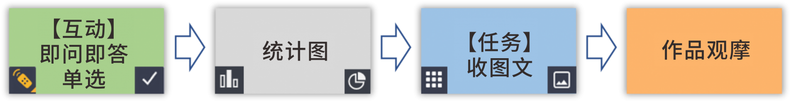 教師呈現(xiàn)學(xué)習(xí)任務(wù)選擇清單,再啟動(dòng)互動(dòng)模塊,請(qǐng)學(xué)生選擇后,接著啟動(dòng)任務(wù)模塊,請(qǐng)學(xué)生根據(jù)選擇,完成任務(wù)后遞交,最后再根據(jù)選項(xiàng)排列作品,挑選作品,進(jìn)行批注、分享、評(píng)價(jià)、觀摩或互評(píng)等學(xué)習(xí)活動(dòng)。