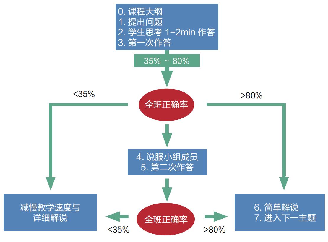 (Peer Instruction,簡(jiǎn)稱為PI),就是二次作答的典型應(yīng)用,如圖16之同儕教學(xué)決策樹,當(dāng)學(xué)生通過率超過一定比率(例如80%)后,就進(jìn)入下一個(gè)概念;通過率小于一定比率(例如50%)時(shí),表示問題太難,教師必須進(jìn)一步解釋;當(dāng)介于兩者之間時(shí),就是最佳的同儕教學(xué)時(shí)機(jī),可進(jìn)行二次作答。