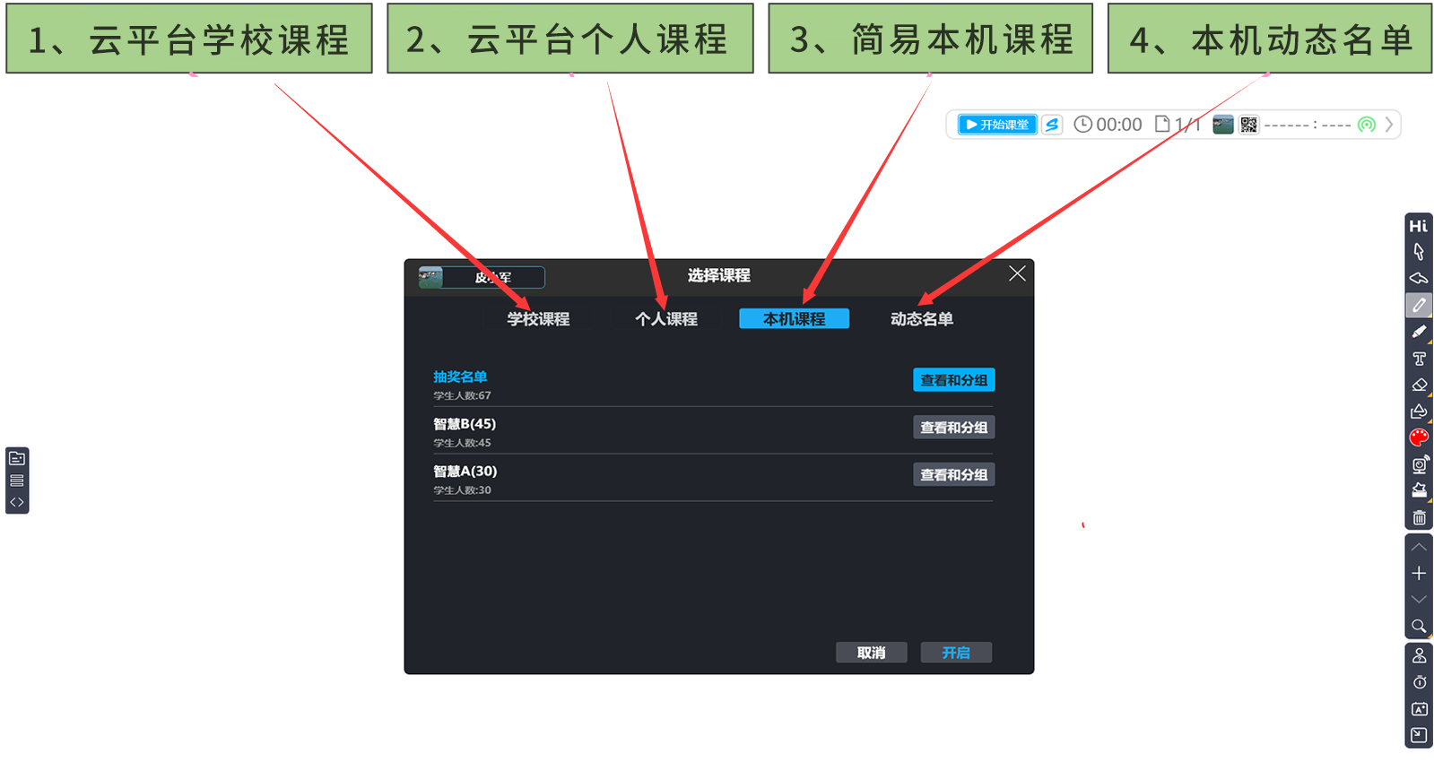 HiTeach 5是三合一教學(xué)軟件,電子白板、師生互動(dòng)、學(xué)習(xí)評(píng)量三合一教學(xué)工具。師生互動(dòng)和學(xué)習(xí)評(píng)量這兩種工具都需要使用課程名單。每一次按下開始課堂鈕,系統(tǒng)會(huì)跳出課程名單選擇視窗。四種課程名單應(yīng)用情境說明如下: