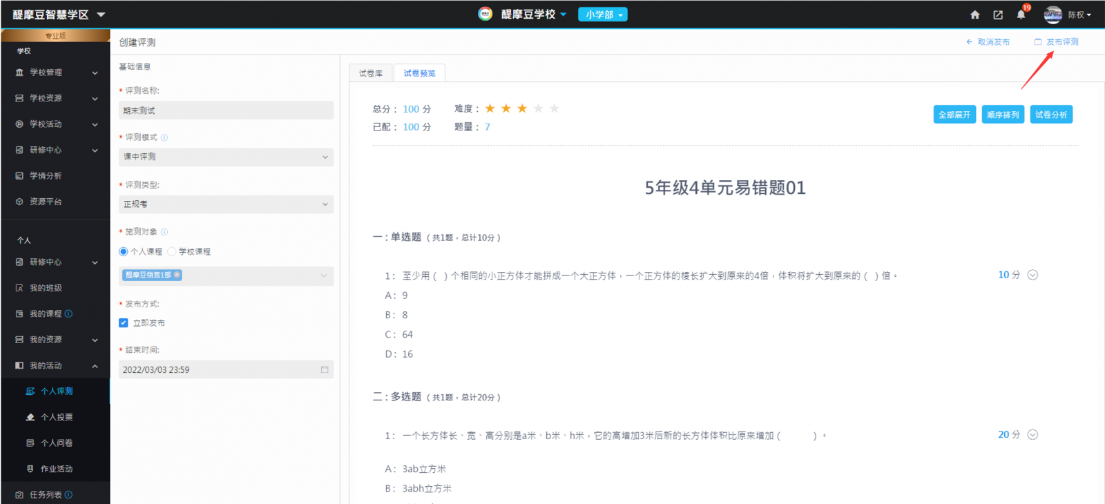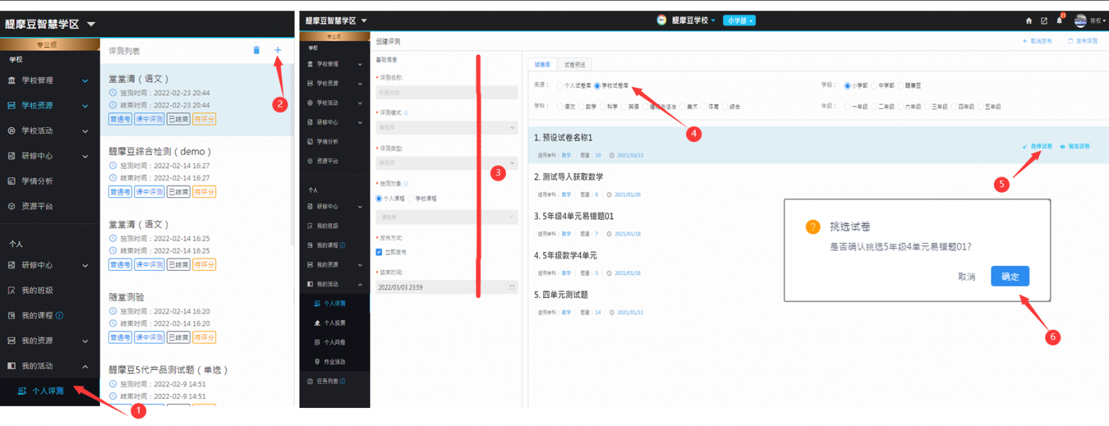 發(fā)布在線自主評(píng)量活動(dòng),需要先準(zhǔn)備好云端試卷。教師只要申請(qǐng)加入智連環(huán)學(xué)校,就可以使用學(xué)校里的試卷資源。下面就以智連環(huán)學(xué)校試卷為例,說明發(fā)布在線自主評(píng)量的操作流程頁面: