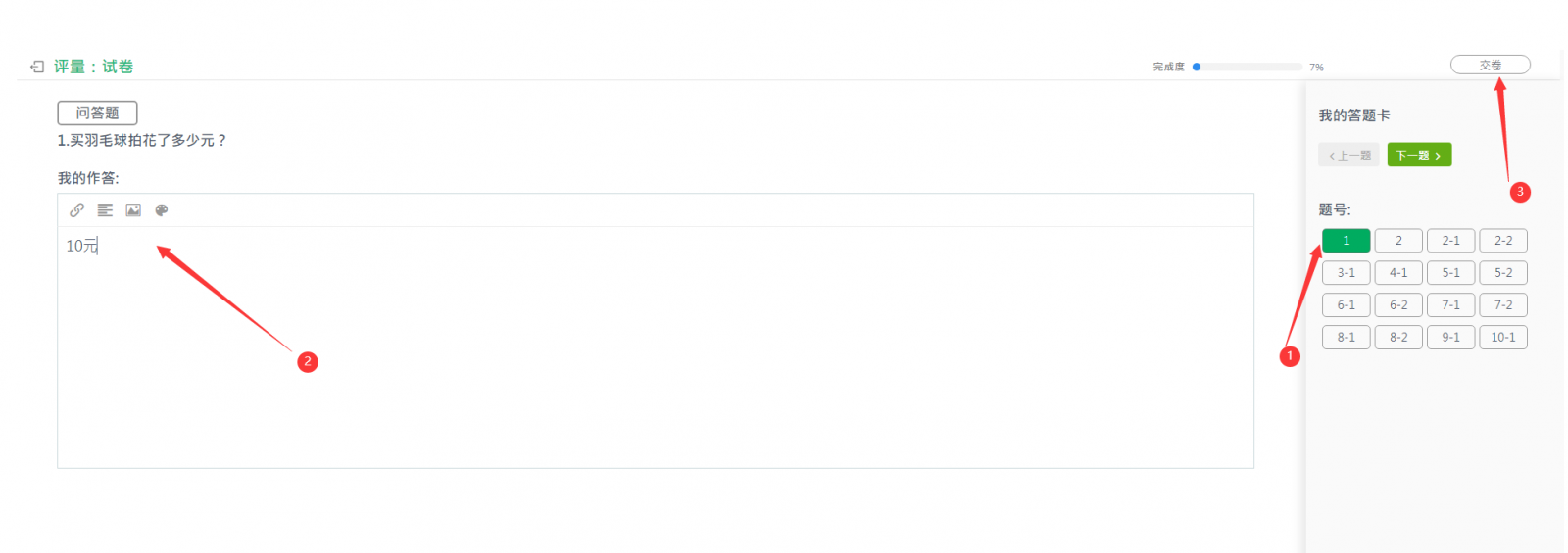 (4) 進(jìn)入作答畫面后,可逐題或選擇題號(hào)作答,完成作答后,選擇交卷鈕,如圖11。