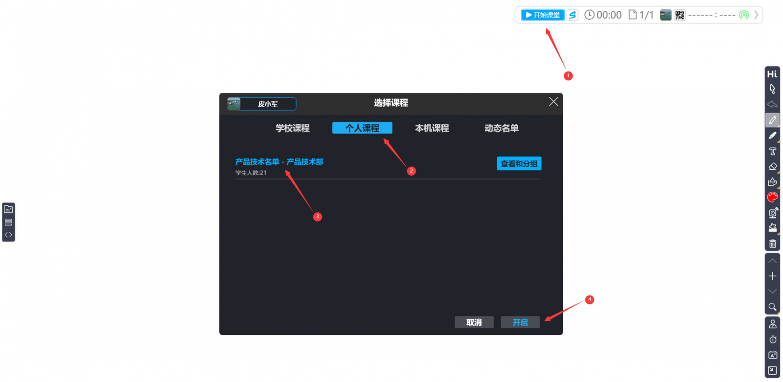 1.在HiTeach選擇開始課堂鈕,出現(xiàn)選擇課程視窗后,按一下個(gè)人課程標(biāo)簽,再選擇課程名單,最后按開啟鈕,如圖20。