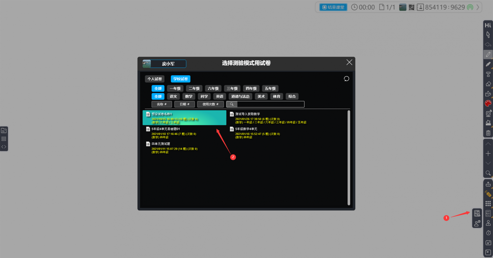 2.選擇測(cè)驗(yàn)?zāi)J解o,再選擇IES云試卷,接著在學(xué)校試卷中選擇一份試卷,如圖21。