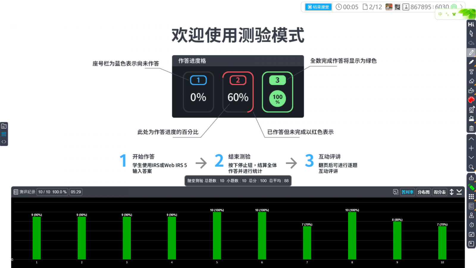 四、智慧教室評(píng)量智慧教室評(píng)量是學(xué)習(xí)評(píng)量數(shù)字化最省力、高效的應(yīng)用情境。在云平臺(tái)建立個(gè)人課程、名單和評(píng)量試卷后,就可以在生生用平板的智慧教室進(jìn)行數(shù)字化的學(xué)習(xí)評(píng)量。操作流程頁面如下: