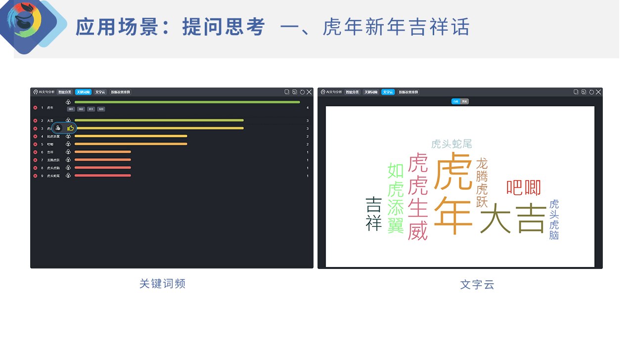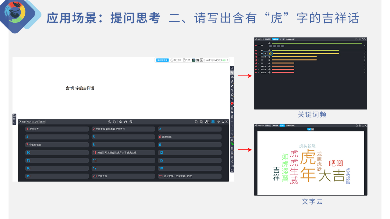 (Brainstorming)應(yīng)用場景,可以快速匯聚文字內(nèi)容的反饋資料,充分激發(fā)全班思考力和創(chuàng)造力。如圖 6之腦力激蕩應(yīng)用場景,虎字吉祥話。