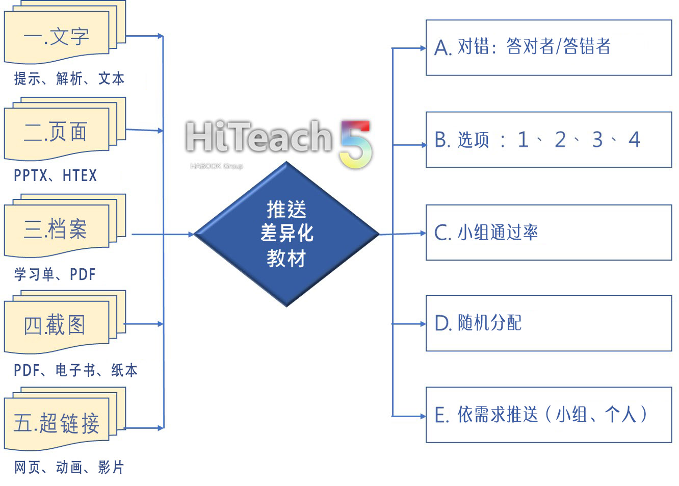 在HiTeach 5課堂中,可以使用的差異化教材,可概分為文字、頁(yè)面、檔案、截圖(或拍照)、超鏈接等五種差異化教材類型,這些多元豐富的差異化教材資源,通過(guò)課堂互動(dòng)數(shù)據(jù)的統(tǒng)計(jì)圖表和差異化教材推送策略,將差異化教材推送(分配)給小組或個(gè)人,常用策略包括根據(jù)對(duì)錯(cuò)數(shù)據(jù)、選項(xiàng)數(shù)據(jù)、通過(guò)率數(shù)據(jù)、隨機(jī)分配,或依據(jù)個(gè)別需求等,快速把教材推送到學(xué)生端,如圖1:差異化教材類型與推送策略。