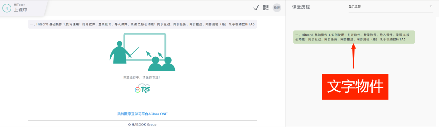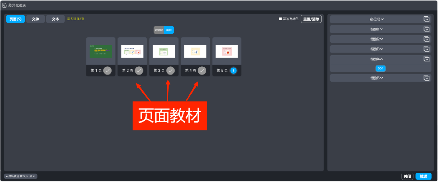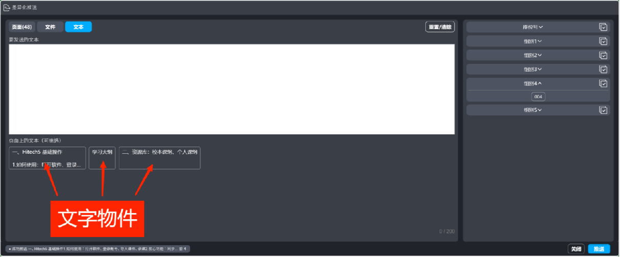頁(yè)面是HiTeach的主要教材單位,而頁(yè)面上的文字物件如圖2,可以作為差異化教材,使用差異化推送功能面板,可以將不同的文字物件,推送給不同的小組或個(gè)人。