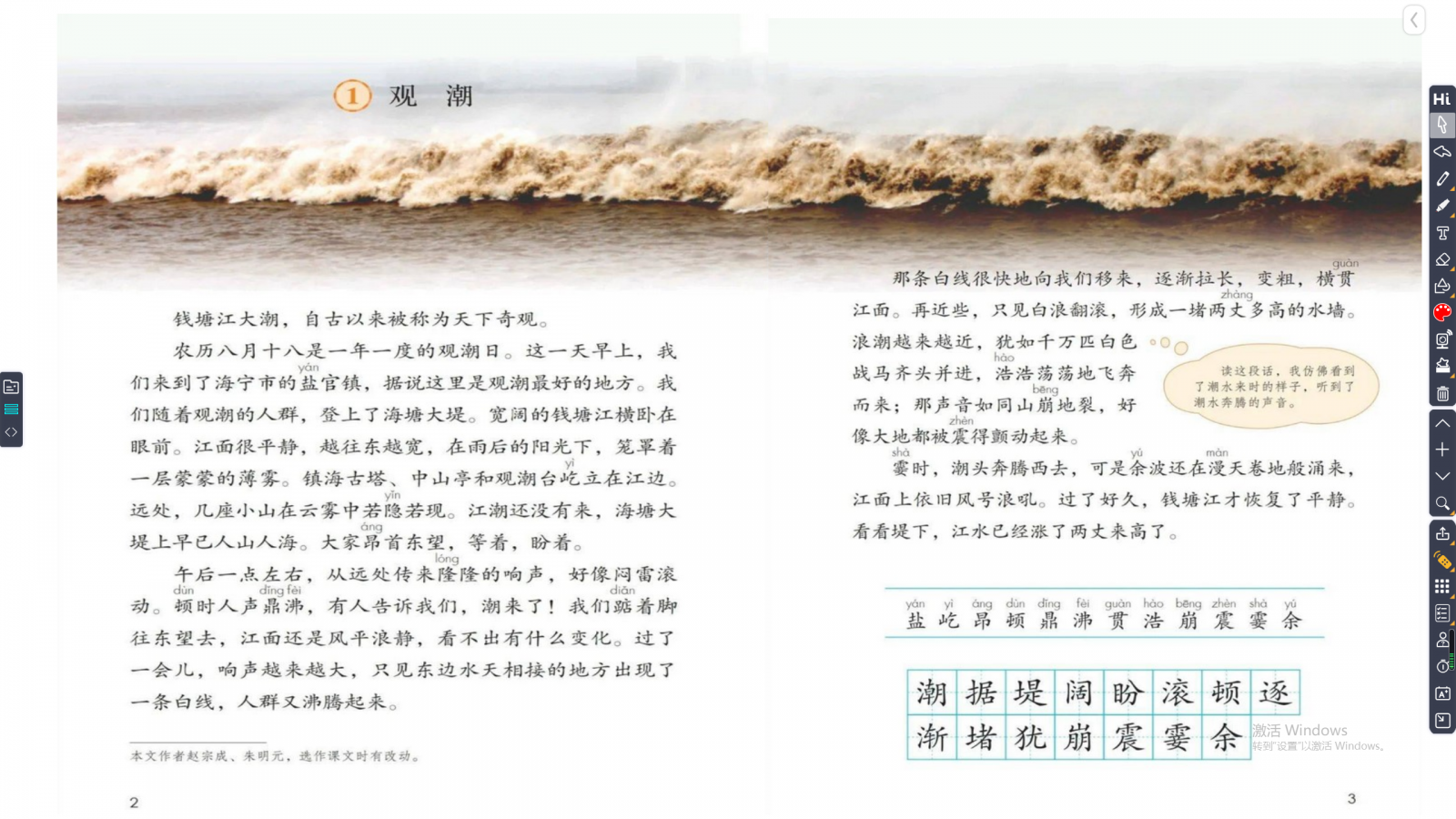 圖11是教師端觀潮教材截圖畫面,圖12是推送到學(xué)生端的畫面。善用截圖功能,就可以將各式各樣的畫面變成HiTeach頁(yè)面教材,然后再運(yùn)用HiTeach的教學(xué)功能來(lái)實(shí)施互動(dòng)學(xué)習(xí)、任務(wù)學(xué)習(xí)、測(cè)驗(yàn)學(xué)習(xí)和差異化學(xué)習(xí)等教學(xué)活動(dòng)。