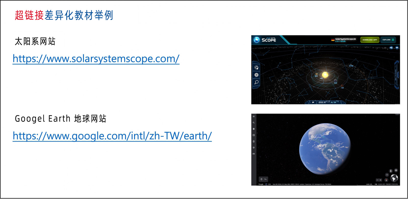 圖13:太陽(yáng)系與Google地球網(wǎng)站超連結(jié)差異化教材