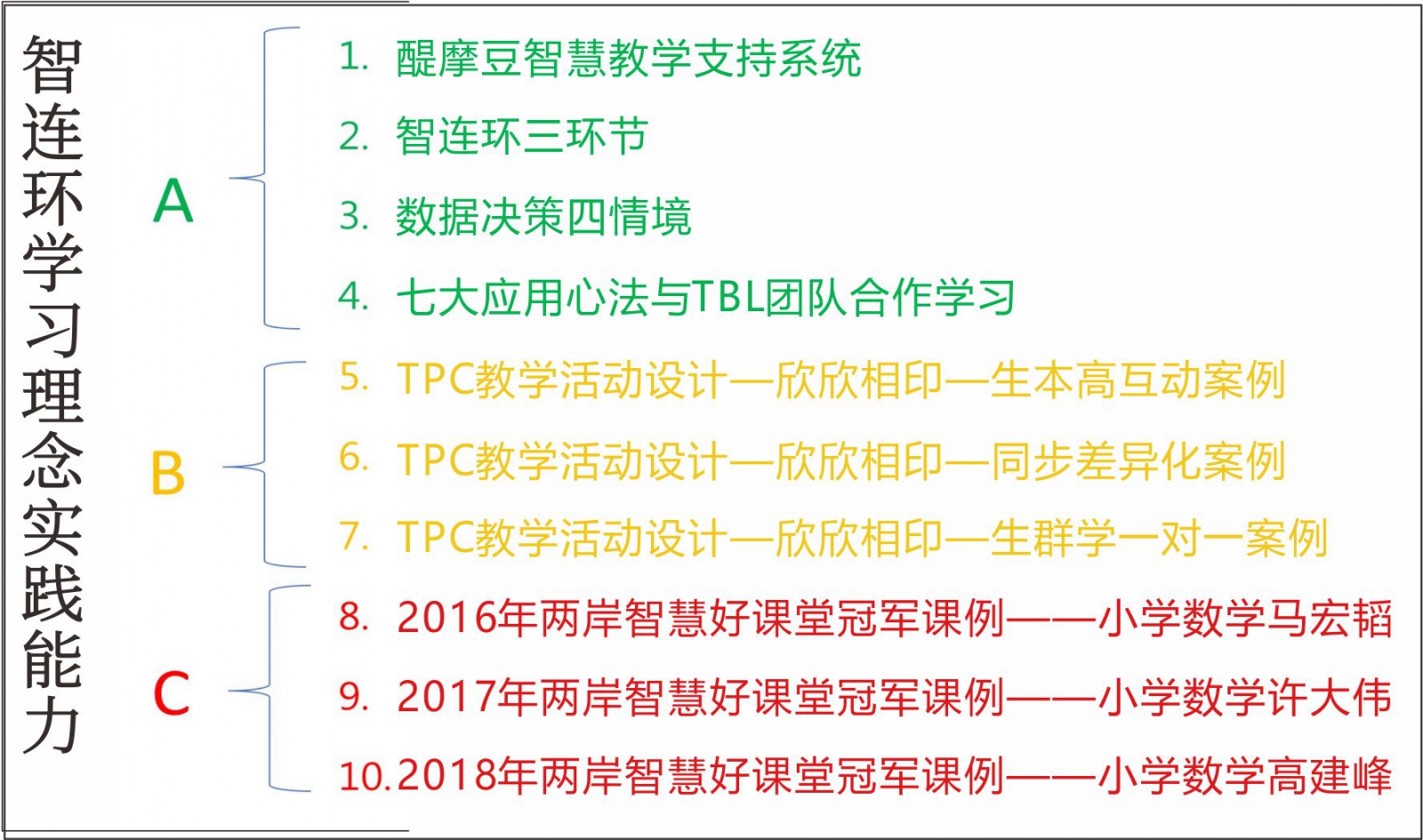 份量不同,設(shè)計(jì)示例:智連環(huán)學(xué)習(xí)理念之三種實(shí)踐能力設(shè)計(jì),如圖23,A類是基本能力,4項(xiàng)都要完成,B類是加廣能力可選2項(xiàng)完成,C類是加深能力可選1項(xiàng)完成。
