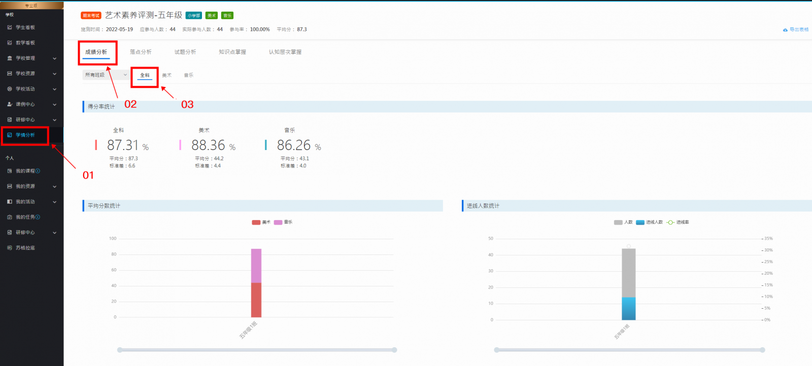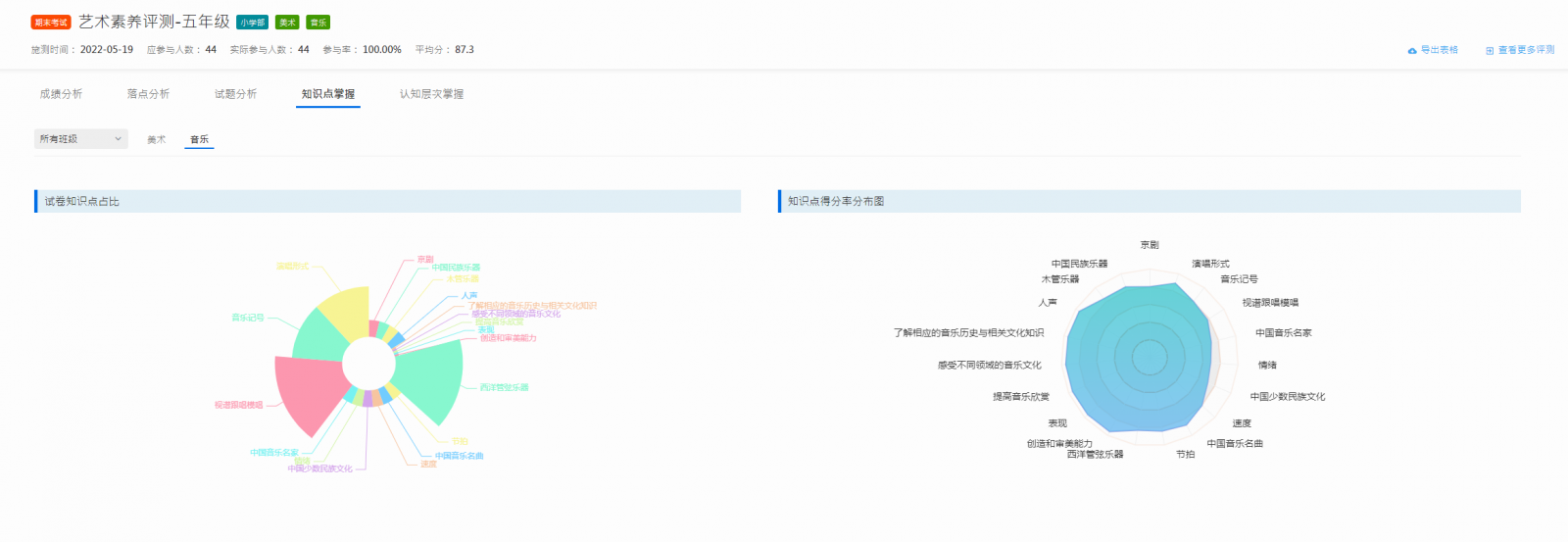 2022年度藝術(shù)素養(yǎng)評測為例,評量活動結(jié)束,自動產(chǎn)出學(xué)習(xí)評量數(shù)據(jù)之后,就可以從學(xué)情分析頁面,點(diǎn)選成績分析標(biāo)簽,就會顯示跨科成績分析,如圖2:跨科成績分析。本次評量有美術(shù)和英語兩個(gè)學(xué)科,一個(gè)班級共44位學(xué)生參加評量,總均分為87.31。并分別列出全科、各科之正答率、平均分、標(biāo)準(zhǔn)差。下方緊接著顯示平均分統(tǒng)計(jì)圖、達(dá)標(biāo)人數(shù)統(tǒng)計(jì)圖,以及圖3:跨科成績分析(全科)得分率分布圖、圖4:跨科成績分析(全科)各班平均與達(dá)標(biāo)率統(tǒng)計(jì)表、圖5:跨科成績分析(全科)達(dá)標(biāo)情況統(tǒng)計(jì)表。