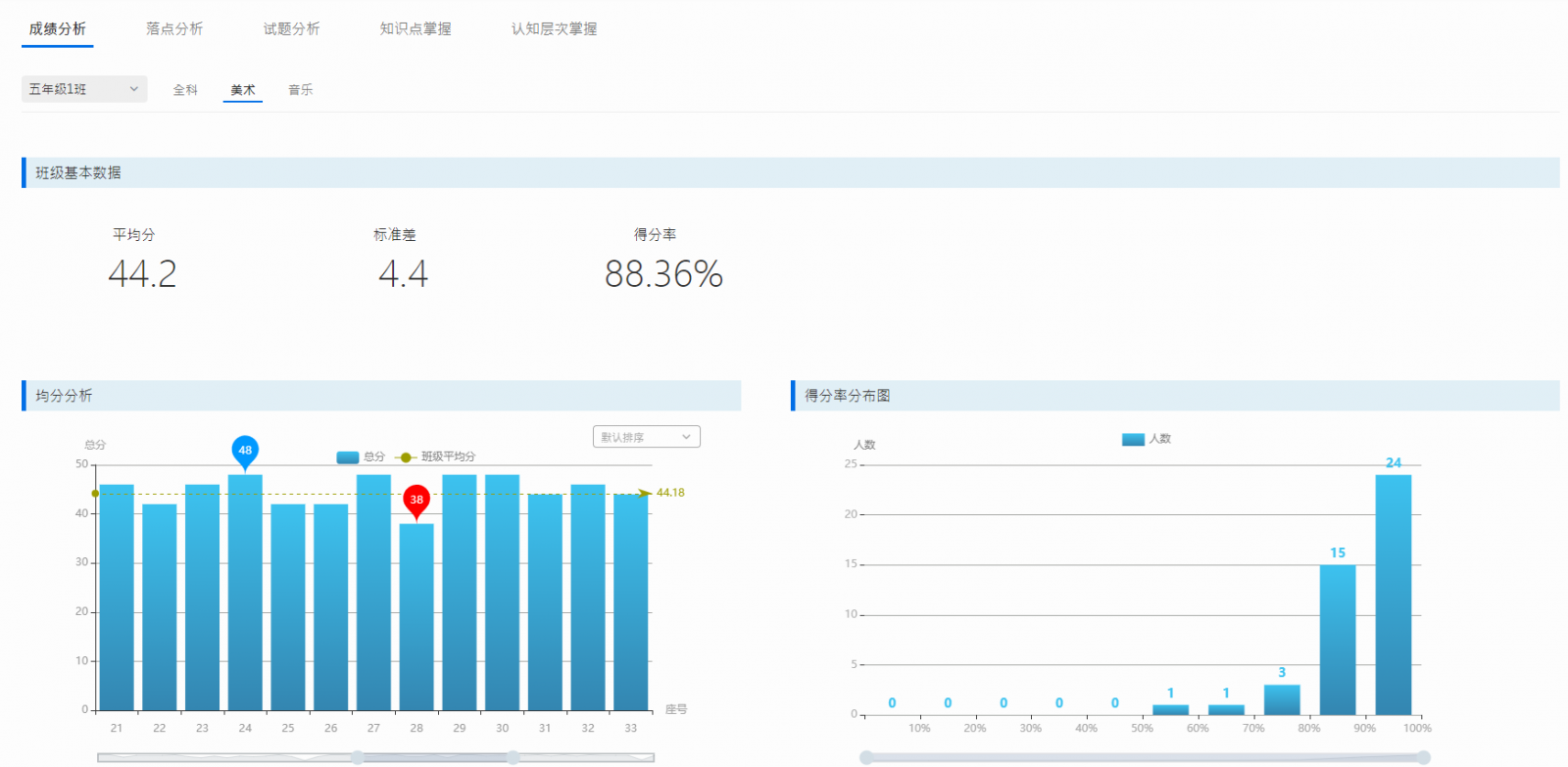 選擇單一學(xué)科時(shí),可顯示該班級單一學(xué)科的基本數(shù)據(jù)、單一學(xué)科平均分析圖和單一學(xué)科得分率分布圖等,如圖