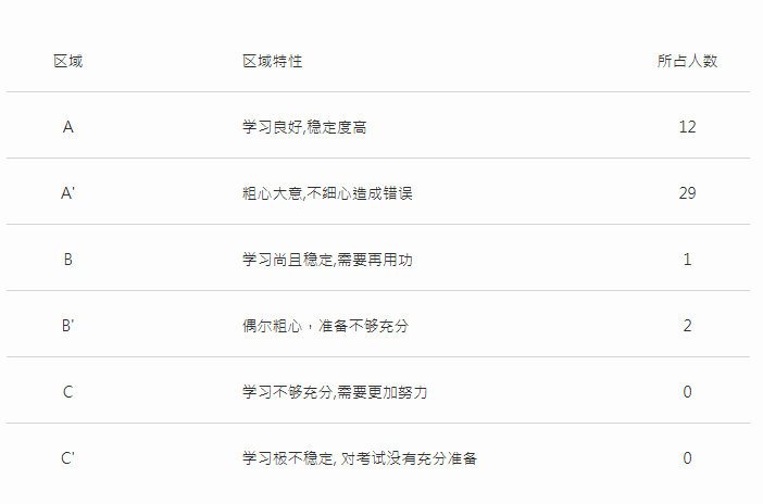 A、A'、B、B'、C、C'等六區(qū),落在A區(qū)的學(xué)生,代表學(xué)習(xí)良好穩(wěn)定度高,落在A'區(qū)的學(xué)生,代表粗心大意不細(xì)心造成錯(cuò)誤,落在B區(qū)的學(xué)生,代表學(xué)習(xí)尚且穩(wěn)定需要再用功,落在B'區(qū)的學(xué)生,代表偶爾粗心準(zhǔn)備不夠充分,落在C區(qū)的學(xué)生,代表學(xué)習(xí)力不夠充分需要更加努力,落在C'區(qū)的學(xué)生,代表學(xué)習(xí)不穩(wěn)定對考試沒有充分準(zhǔn)備,如圖11。