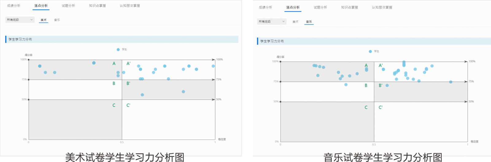 根據(jù)學(xué)習(xí)評量穩(wěn)定度所繪制的學(xué)生學(xué)習(xí)力落點(diǎn)分布圖,根據(jù)學(xué)習(xí)評量數(shù)據(jù),計(jì)算出每一位學(xué)生的學(xué)習(xí)評量穩(wěn)定度