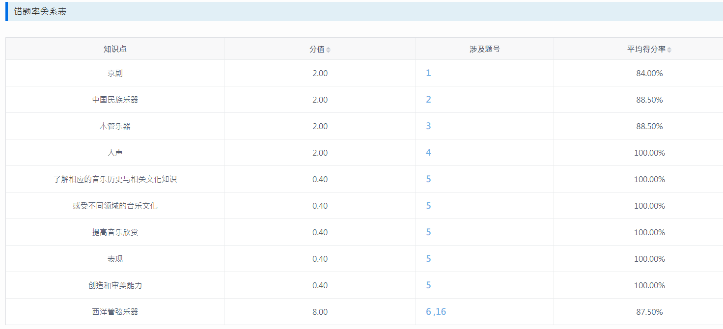 16:知識點(diǎn)得分率關(guān)系表,圖17:知識點(diǎn)得分率統(tǒng)計(jì)圖與知識點(diǎn)得分詳情表,圖18:知識點(diǎn)錯(cuò)誤率關(guān)系表。