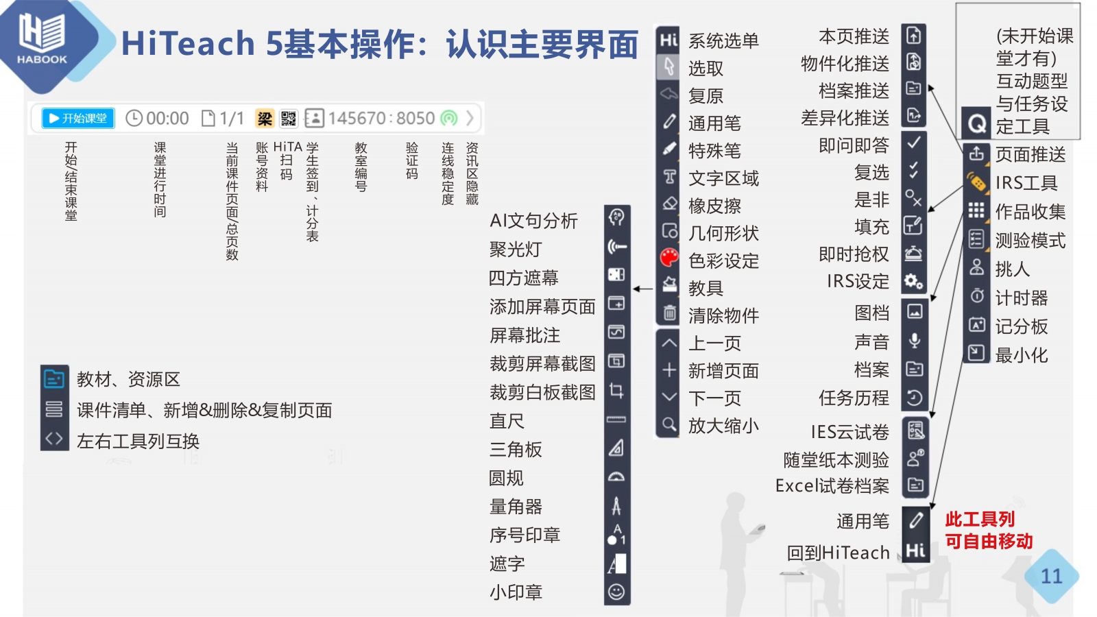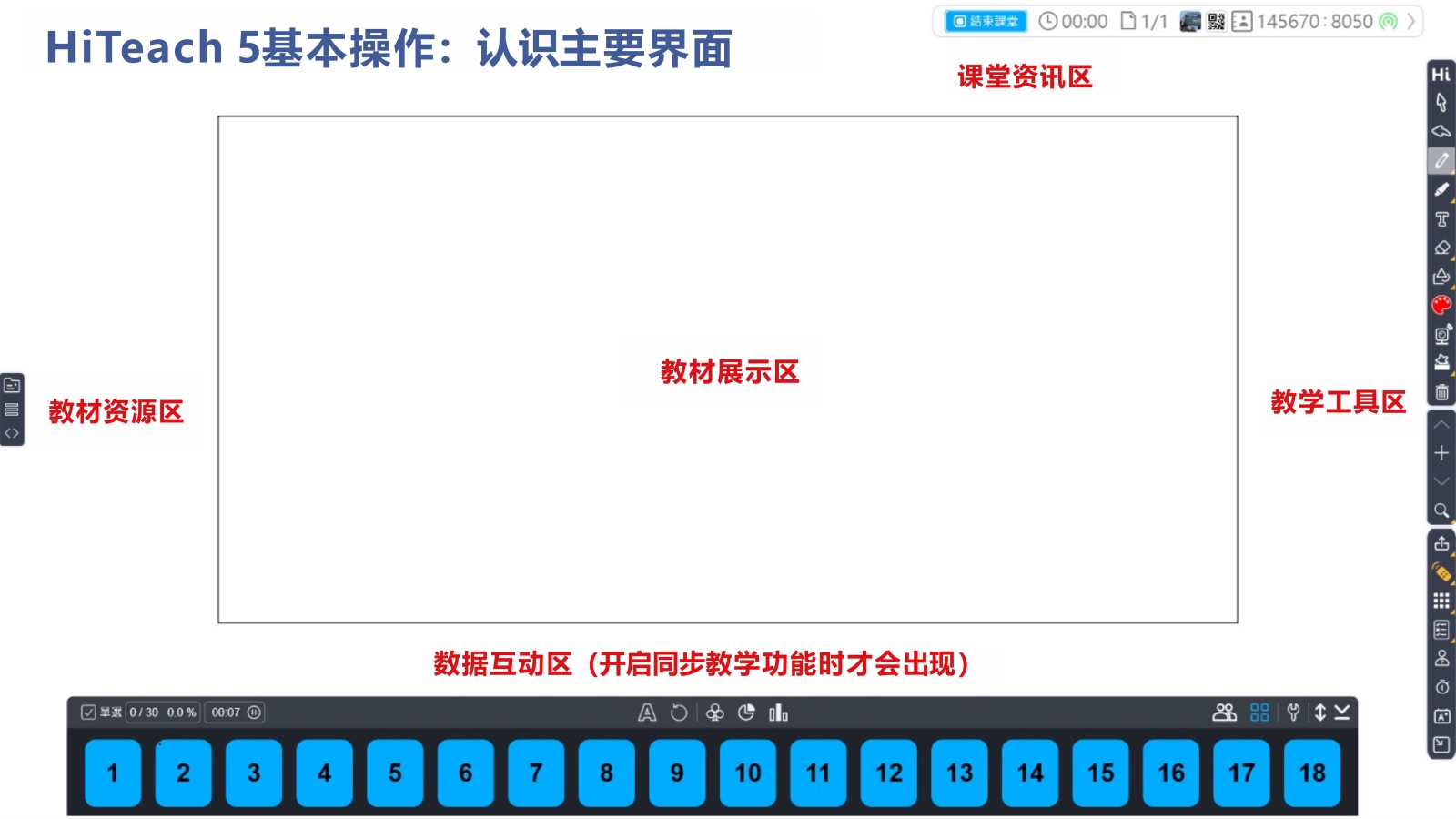 HiTeach 5新手入門(mén)教學(xué) 1_基礎(chǔ)界面操作教學(xué).PPTX。例如,基礎(chǔ)界面操作教學(xué)中,介紹如何開(kāi)啟軟件、認(rèn)識(shí)基本界面、建立名單、開(kāi)始課堂、選擇名單、點(diǎn)名簽到、認(rèn)識(shí)主要界面等,如圖3:HiTeach的功能分區(qū),圖4:HiTeach的工具按鈕與名稱。