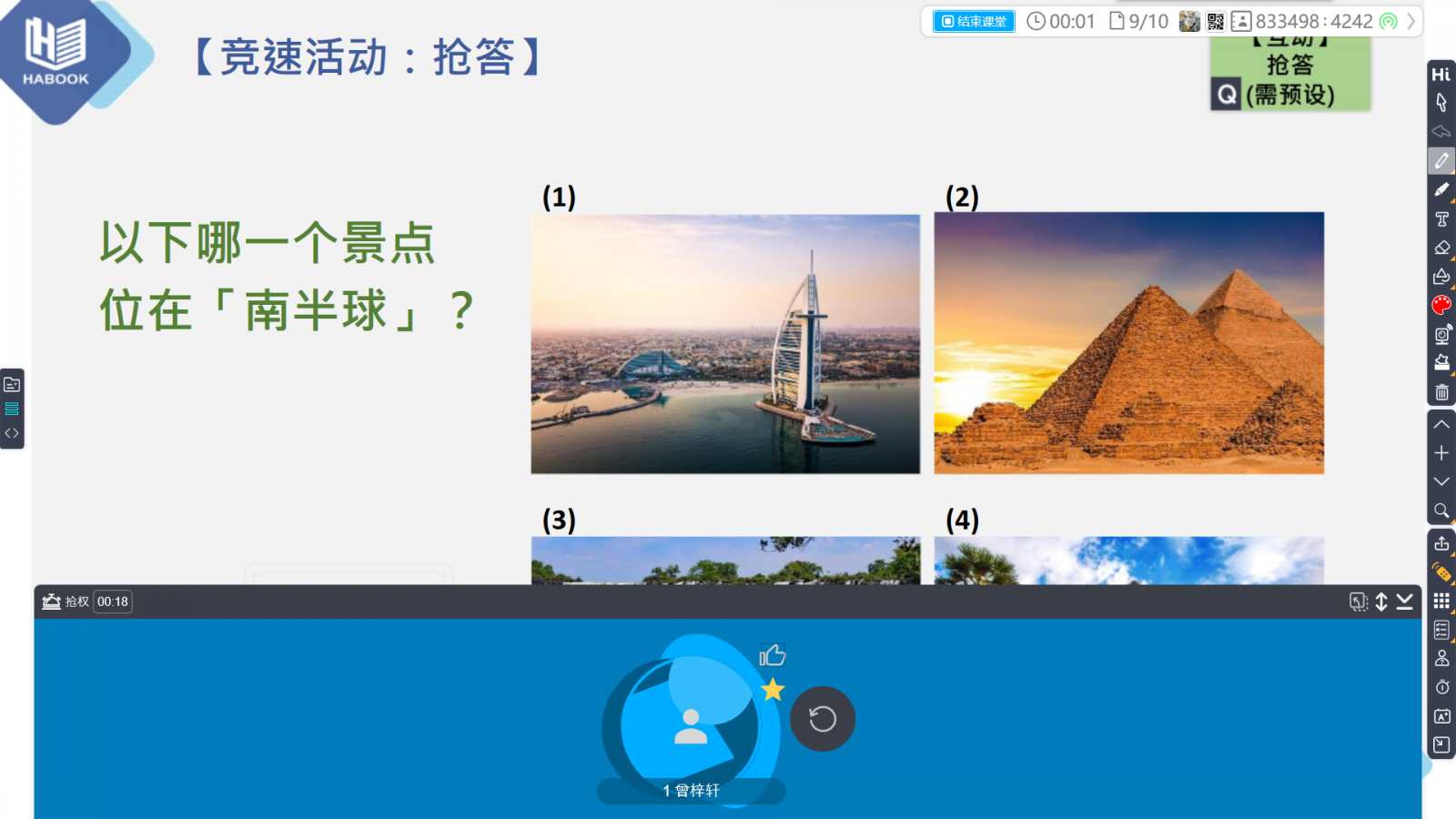 圖5:實(shí)時(shí)互動(dòng)問(wèn)答范例檔畫(huà)面 實(shí)時(shí)互動(dòng)問(wèn)答范例中,分別就單選、復(fù)選、填充、是非、搶權(quán)、搶答等IRS工具,各舉一個(gè)應(yīng)用頁(yè)面示例,例如搶答畫(huà)面如圖6(先設(shè)定搶答模式,這樣開(kāi)始課堂后,就可讓學(xué)生搶答)。