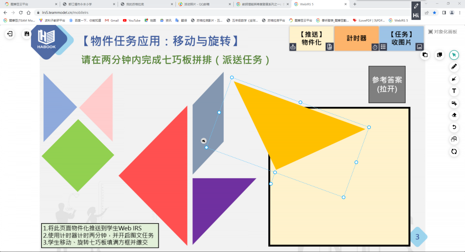 圖7:物件化的教材與任務(wù)范例畫(huà)面 物件化的教材與任務(wù)范例中,分別就物件化操作:移動(dòng)、旋轉(zhuǎn)、操連結(jié)等,各舉一個(gè)應(yīng)用頁(yè)面示例。圖8是學(xué)生端旋轉(zhuǎn)七巧板物件的畫(huà)面。