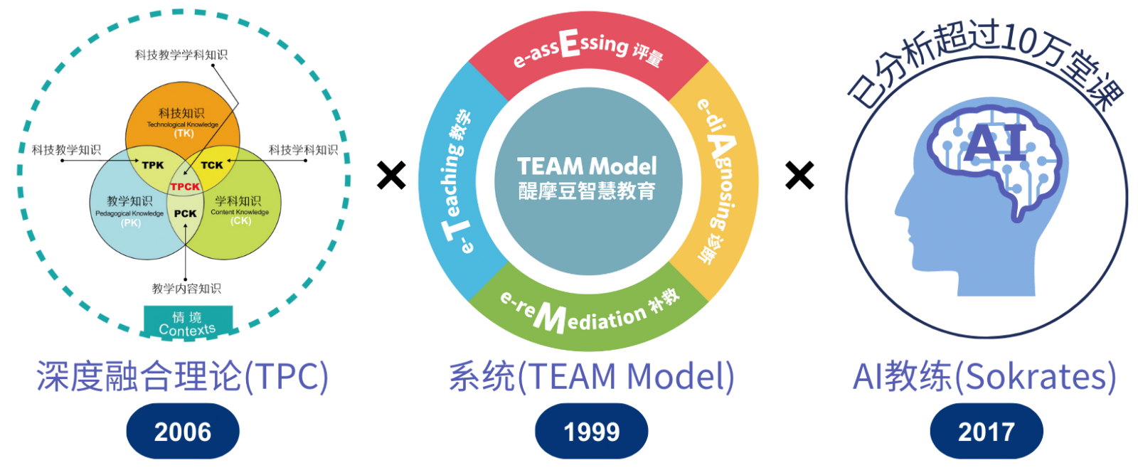根據(jù)TPACK理論,智慧教室的建置重點目標(biāo)是要能夠把科技知識(Technological Knowledge)、教法知識(Pedagogical Knowledge)、學(xué)科知識(Content Knowledge)深度融合,科技對教學(xué)上的幫助才能發(fā)揮出來,教師們的培訓(xùn)與專業(yè)發(fā)展格外重要。醍摩豆(TEAM Model)智慧教育支持系統(tǒng)融合教學(xué)理論、科技輔助支持與AI技術(shù)應(yīng)用,結(jié)合領(lǐng)域?qū)I(yè)講師、專家指導(dǎo)、社群發(fā)展等機(jī)制,將能確實循序漸進(jìn)地促進(jìn)教師增能與持續(xù)專業(yè)發(fā)展(Continuous Professional Development,簡稱CPD)。