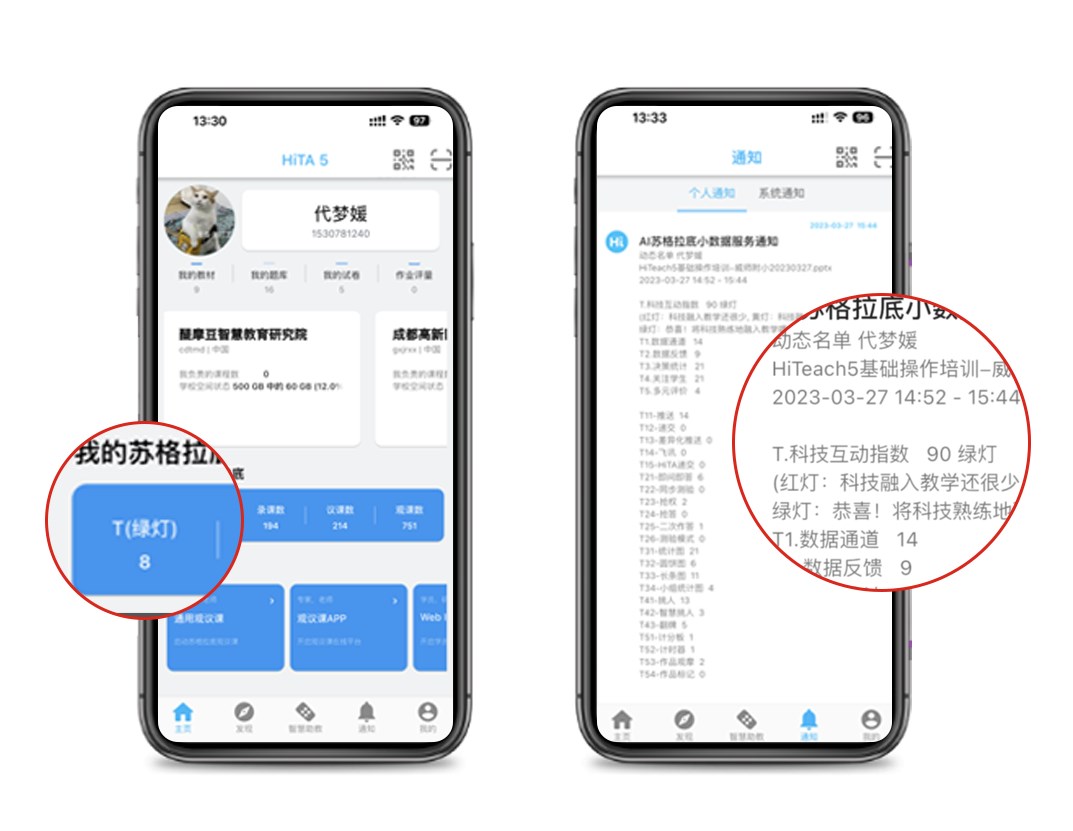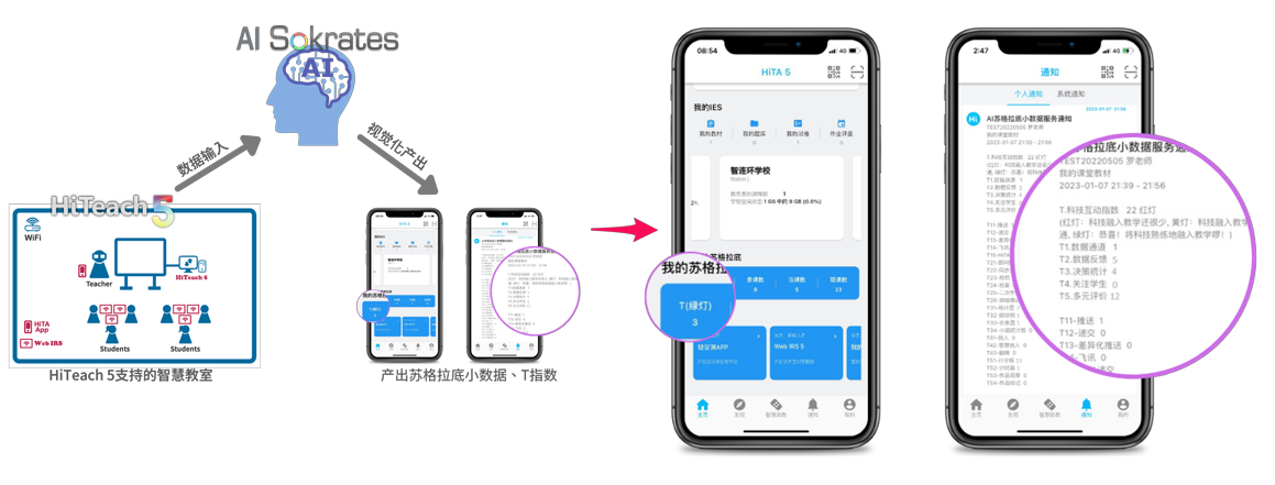 AI蘇格拉底小數(shù)據(jù)是AI蘇格拉底系統(tǒng)數(shù)據(jù)服務(wù)之一。使用者每一次使用HiTeach進(jìn)行互動課堂,課堂結(jié)束后,系統(tǒng)會自動發(fā)送通知到教師自己的HiTA 5 APP,提供本次課堂的科技互動(T)指數(shù)和科技互動頻次分析,簡稱為【蘇格拉底小數(shù)據(jù)】。能實時反饋每一堂課之科技應(yīng)用偏好和指數(shù),加速熟練HiTeach科技互動功能,是陪伴教師增能科技互動的AI小教練。