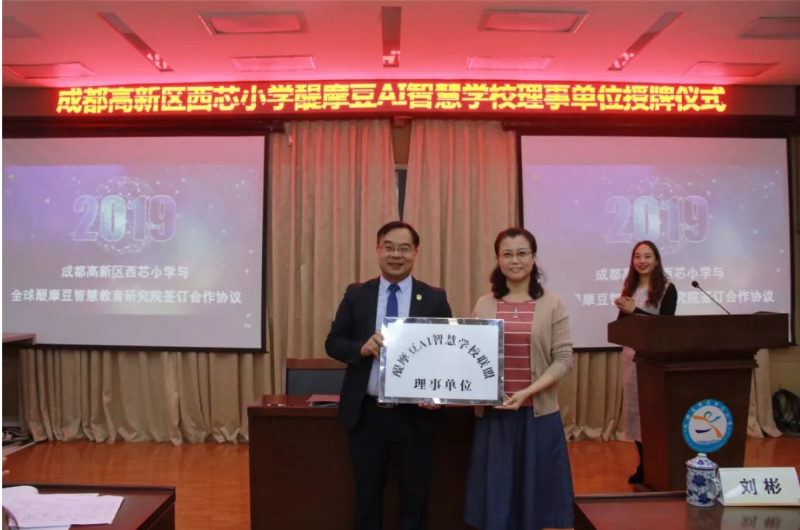 之后,由劉彬校長(zhǎng)親自授牌成都高新區(qū)西芯小學(xué)“醍摩豆AI智慧學(xué)校聯(lián)盟理事單位”牌匾。