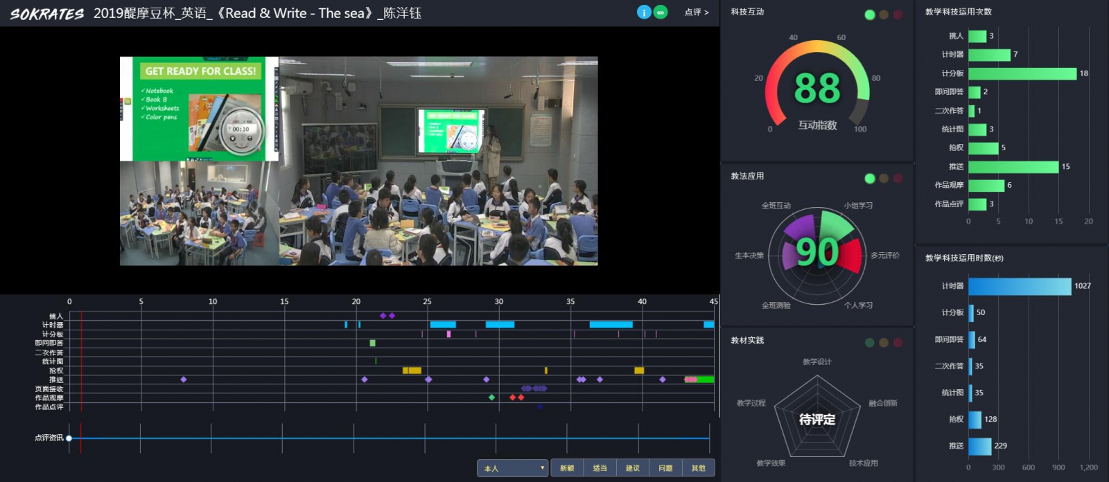 自主學習與實驗探究能力,以及分享表達能力。其中,陳洋鈺老師巧妙地通過交叉使用醍魔豆智慧教學系統(tǒng)中的挑人,計時器,計分板,即問即答,二次作答,統(tǒng)計圖,搶權,推送,飛遞,作品觀摩等功能,使學生能夠對本節(jié)讀寫結合課產(chǎn)生極大的學習興趣,同時智慧教學新方式給予學生更大的學習專注度。