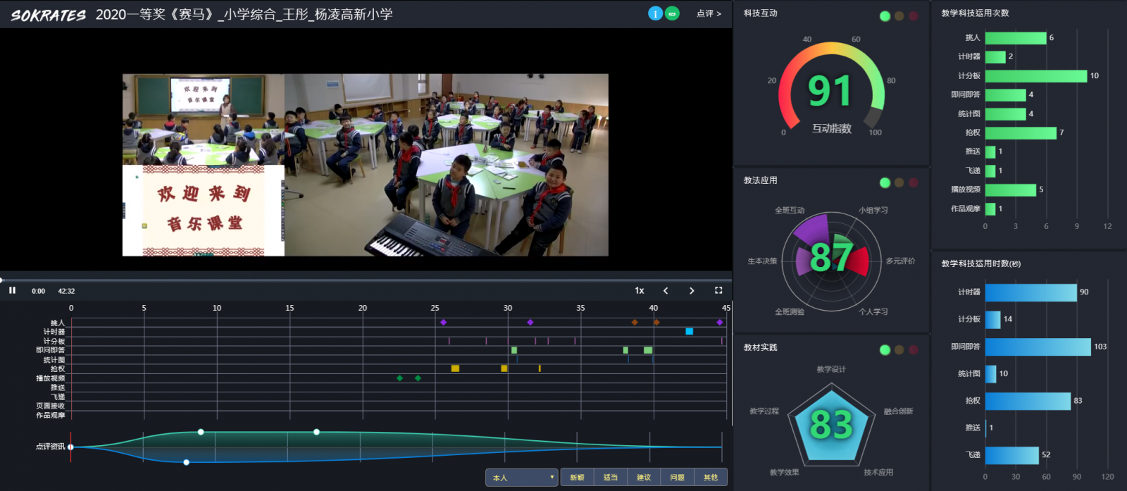 本課從情境創(chuàng)設(shè)出發(fā),調(diào)動(dòng)學(xué)習(xí)興趣導(dǎo)入本課教學(xué),分段聆聽(tīng)中分別采用強(qiáng)弱情緒對(duì)比、模仿表演、模唱旋律、辨識(shí)二胡音色、模仿二胡演奏技巧等多種教學(xué)手段,激發(fā)對(duì)我國(guó)民族樂(lè)器的濃厚興趣。特別是在認(rèn)識(shí)二胡的環(huán)節(jié),通過(guò)即問(wèn)即答、智慧挑人等智慧手段了解二胡和京胡的音色特點(diǎn),讓學(xué)生在教學(xué)活動(dòng)中知道如何區(qū)分二胡與京胡,總結(jié)出可以通過(guò)體積大小和音色高低來(lái)區(qū)分。在教學(xué)中我采用“體驗(yàn)、模仿、探究”等方法,激發(fā)學(xué)生的創(chuàng)造力和表現(xiàn)力,引導(dǎo)學(xué)生積極主動(dòng)地參與表現(xiàn)。并通過(guò)結(jié)合Hiteach智慧教學(xué)采用數(shù)據(jù)互動(dòng)。例如:助教、推送、評(píng)量、智慧挑人、及時(shí)反饋等科技互動(dòng)的頻次,實(shí)現(xiàn)師生互動(dòng)與小組合作,在智慧教學(xué)的輔助下更高效的完成本節(jié)課。