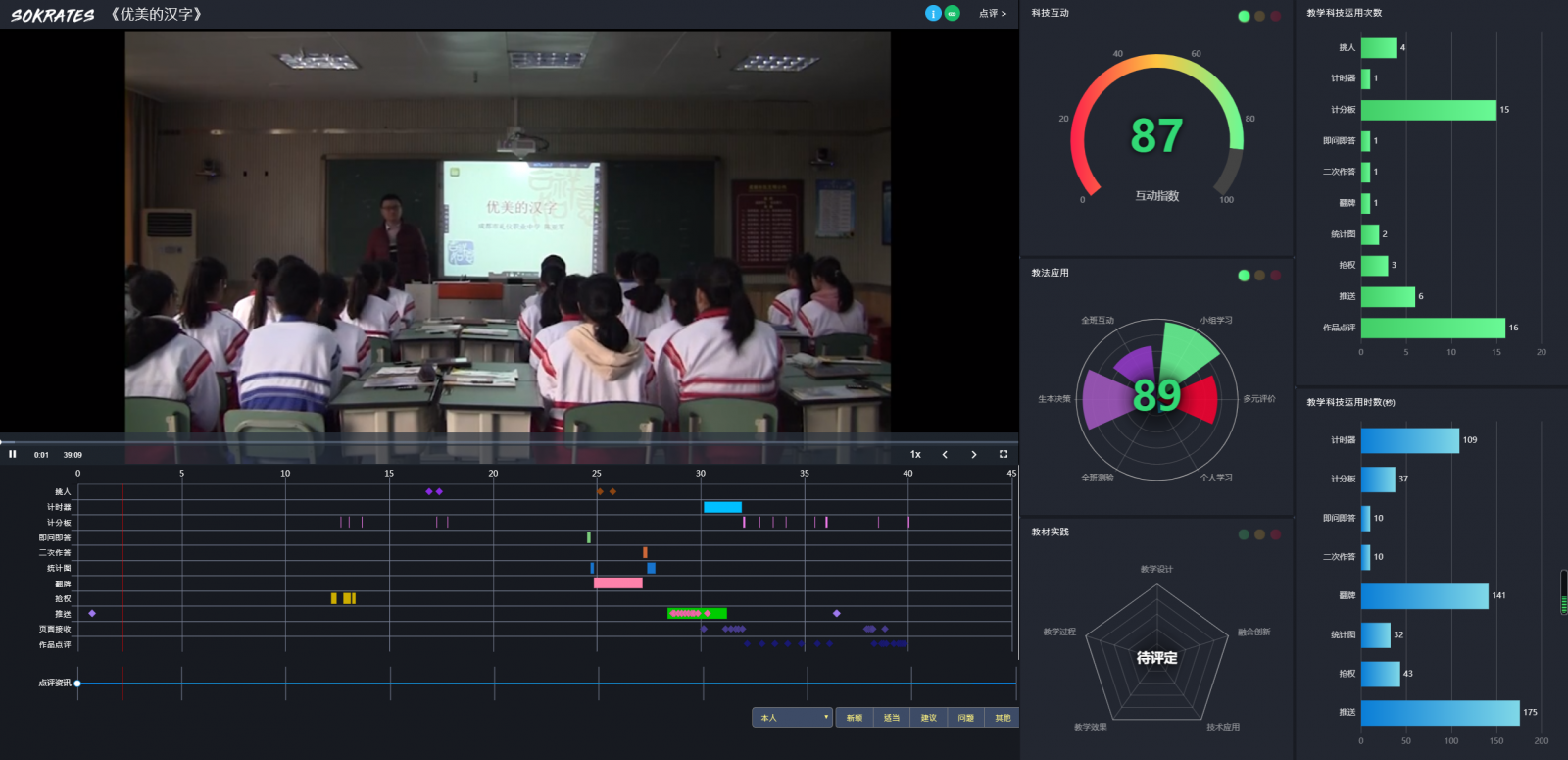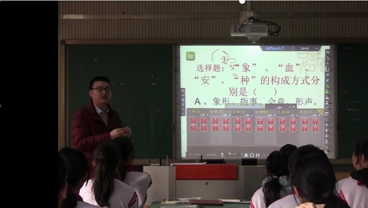 陳亞軍老師利用歌曲把學(xué)生帶入相關(guān)情景,并激發(fā)思考。利用電子白板和智慧筆引導(dǎo)學(xué)生進(jìn)行漢字起源探究。用HiTeach軟件中智慧筆、放大鏡、聚光燈、遮擋板等工具引導(dǎo)學(xué)生梳理漢字漢字演變過(guò)程,并用IRS即時(shí)反饋器和隨機(jī)抽人及時(shí)掌握學(xué)生探究情況。用智慧筆、放大鏡、聚光燈等工具引導(dǎo)學(xué)生探究漢字結(jié)構(gòu),用HiTIRS投票選擇反饋學(xué)生掌握情況。用平板推送任務(wù),學(xué)生在HiLeaning中實(shí)現(xiàn)合作探究。學(xué)生將探究結(jié)果推送給老師,實(shí)現(xiàn)師生高效交流。