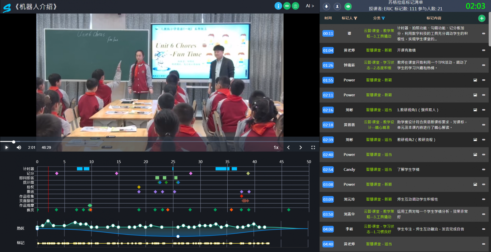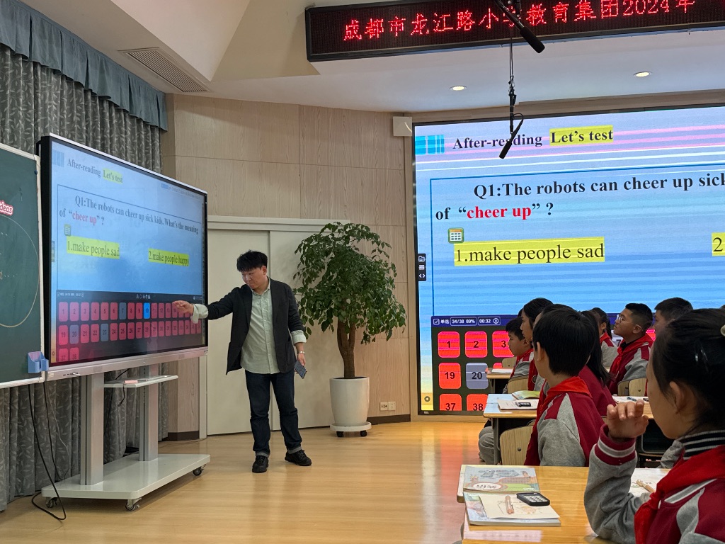 成都市龍江路小學(xué)中糧祥云分校邱博愛老師帶來英語課堂展示:五年級英語《機(jī)器人介紹》,邱老師熟練運(yùn)用HiTeach智慧教學(xué)系統(tǒng)作品展示+互評,即問即答數(shù)據(jù)決策等,讓課堂教學(xué)更輕松,孩子學(xué)習(xí)更快樂。