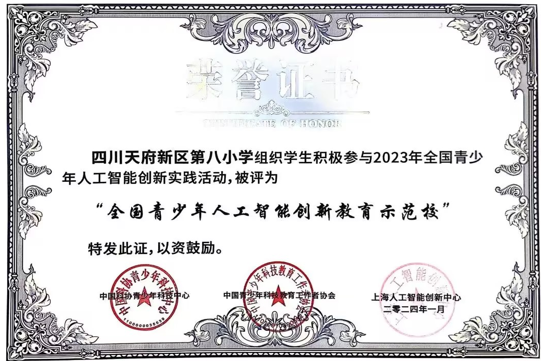 2023年,天府八小獲評(píng)“全國(guó)青少年人工智能創(chuàng)新教育示范校”“四川省青少年科技教育創(chuàng)新實(shí)驗(yàn)校”,