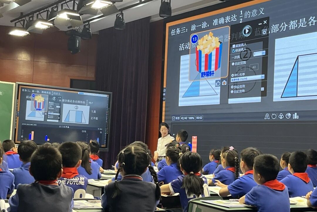 在課堂中,教師運(yùn)用HiTeach5人工智能授課平臺和反饋系統(tǒng),利用智慧測評,促進(jìn)了全體學(xué)生的參與,讓學(xué)習(xí)真實(shí)發(fā)生,教師則利用AI數(shù)據(jù)的反饋,及時(shí)優(yōu)化或調(diào)整教學(xué)策略與內(nèi)容。“‘反饋器’是我們在教學(xué)中常常使用到的一個(gè)工具,傳統(tǒng)課堂中,學(xué)生回答問題時(shí),可能會跟隨聲音大的孩子,選擇同一個(gè)答案,但其實(shí)他真正選擇的是哪個(gè)選項(xiàng),教師也不知道。反饋器每位學(xué)生都有一個(gè),他們可以自主選擇答案,教師可以了解學(xué)生對這個(gè)知識點(diǎn)的掌握程度,進(jìn)而調(diào)整教學(xué)重點(diǎn)。”人工智能種子教師楊秋紅談到。